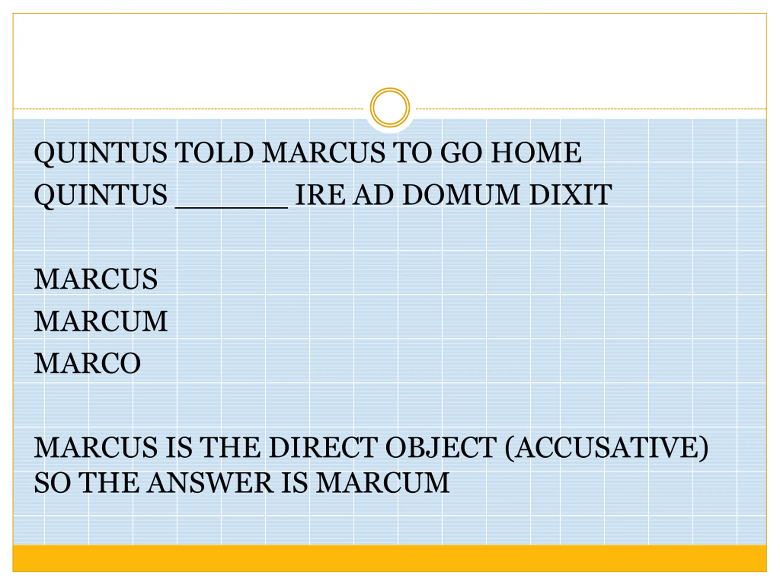 QUINTUS TOLD MARCUS TO GO HOME QUINTUS ______ IRE AD DOMUM DIXIT MARCUS MARCUM MARCO MARCUS IS THE DIRECT OBJECT (ACCUSATIVE) SO THE ANSWER IS MARCUM