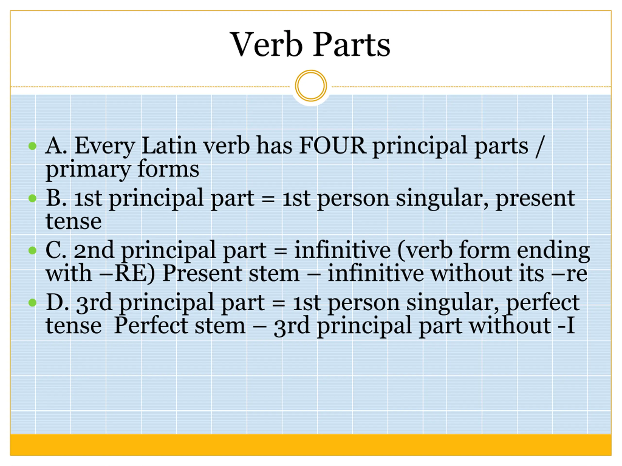Verb Parts A. Every Latin verb has FOUR principal parts / primary forms B. 1st principal part = 1st person singular, present tense C. 2nd principal part = infinitive (verb form ending with RE) Present stem infinitive without its re D. 3rd principal part = 1st person singular, perfect tense Perfect stem 3rd principal part without -I