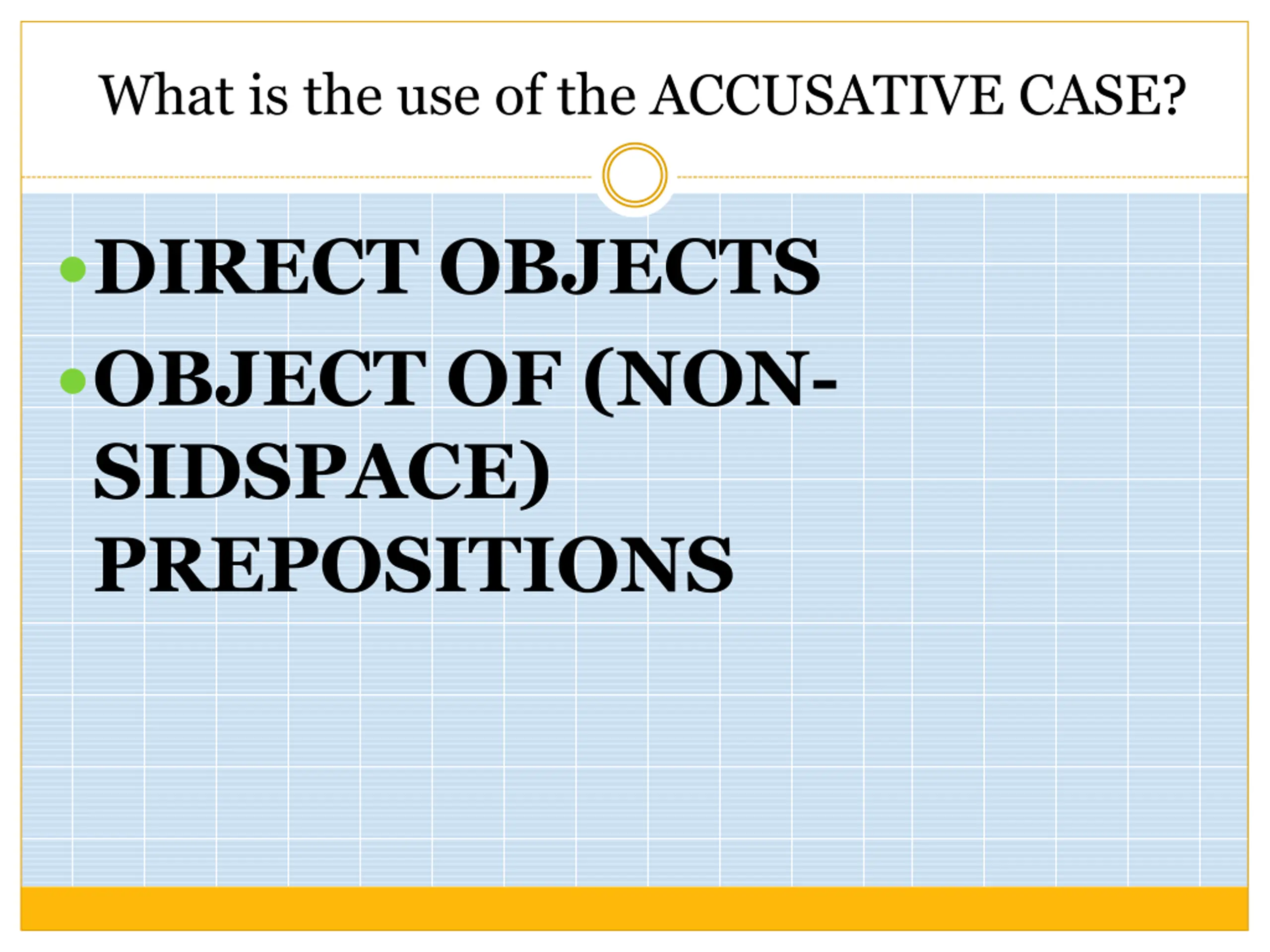 What is the use of the ACCUSATIVE CASE? DIRECT OBJECTS OBJECT OF (NON- SIDSPACE) PREPOSITIONS