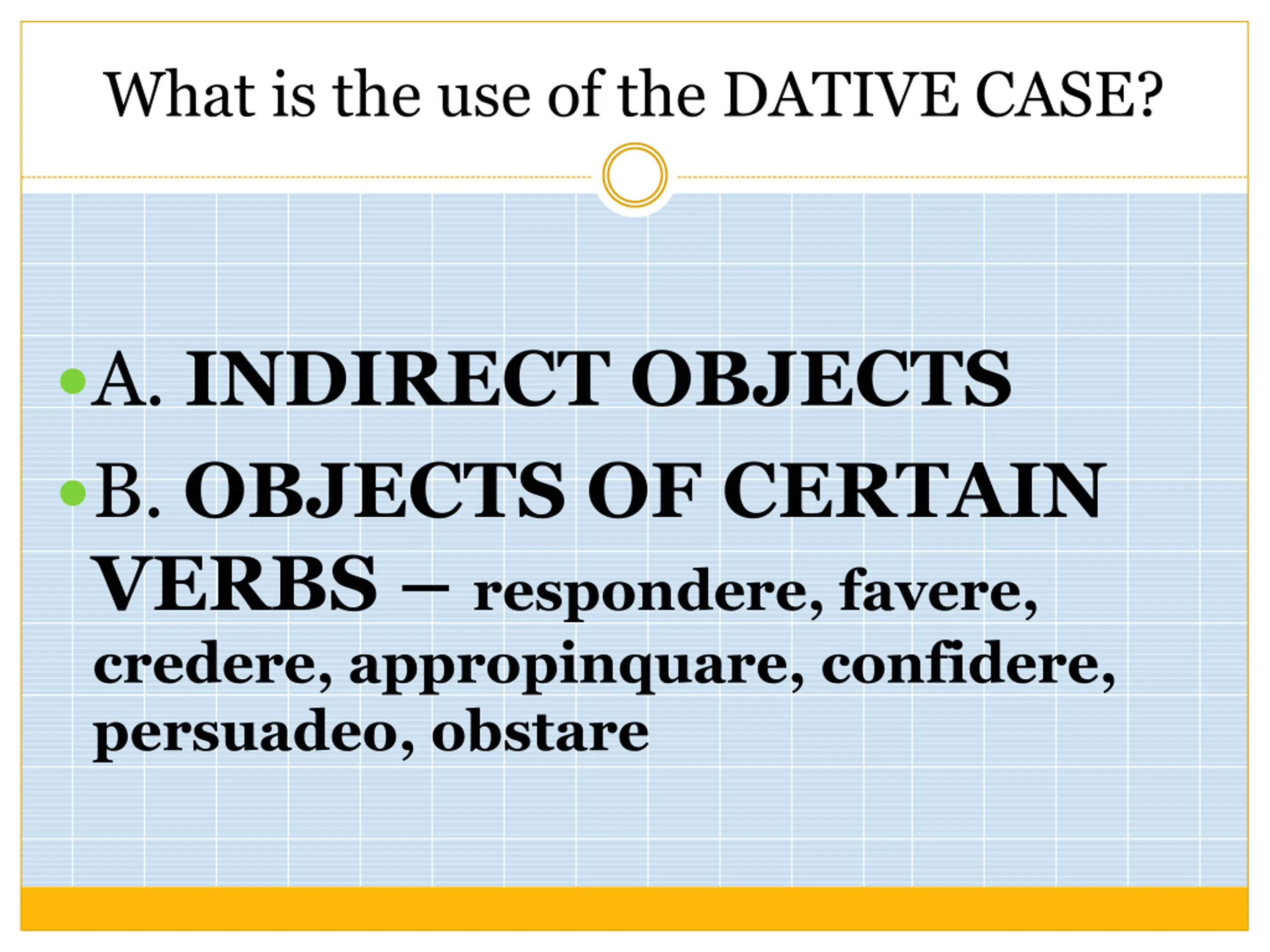 What is the use of the DATIVE CASE? A. INDIRECT OBJECTS B. OBJECTS OF CERTAIN VERBS respondere, favere, credere, appropinquare, confidere, persuadeo, obstare