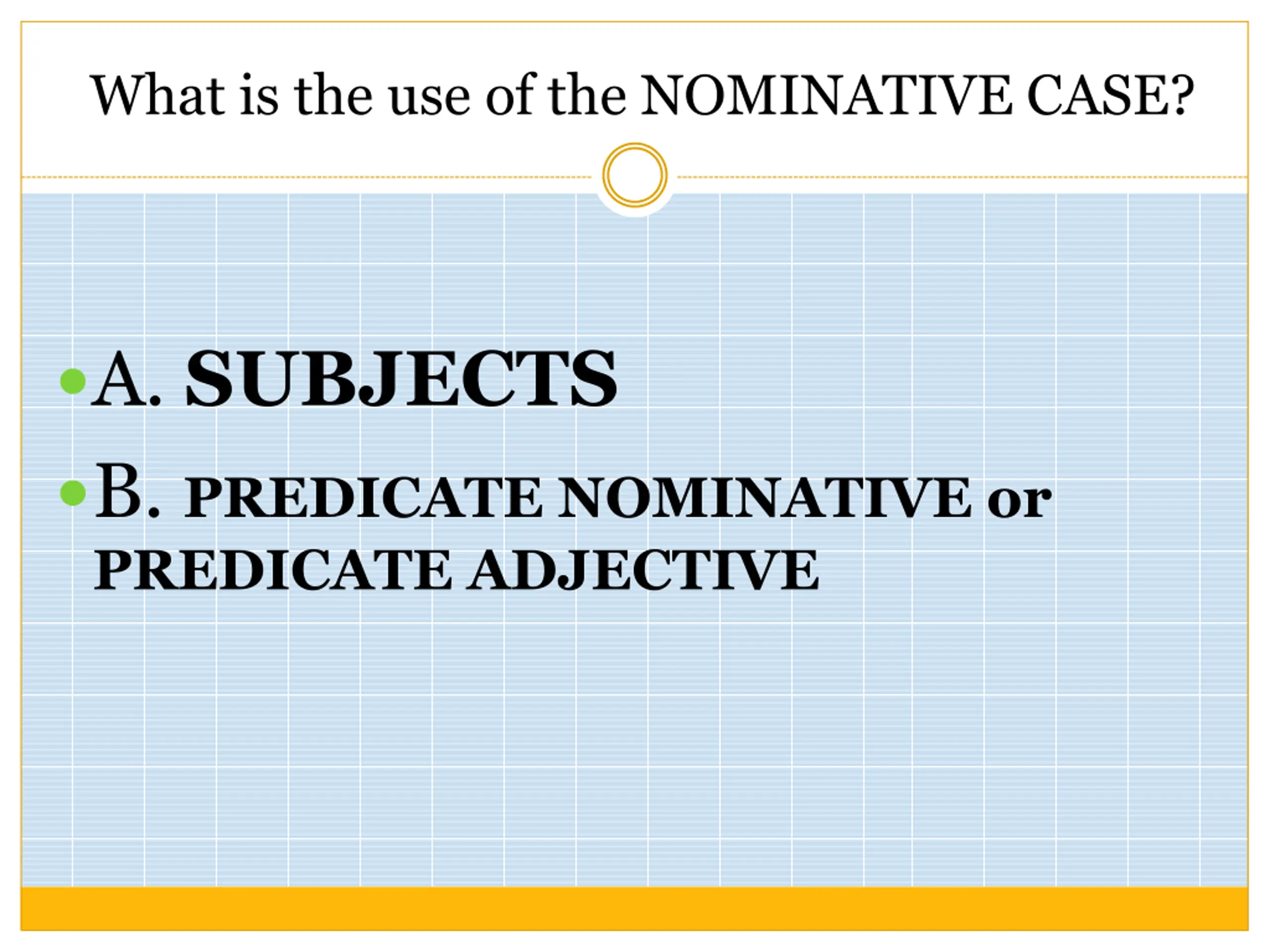 What is the use of the NOMINATIVE CASE? A. SUBJECTS B. PREDICATE NOMINATIVE or PREDICATE ADJECTIVE