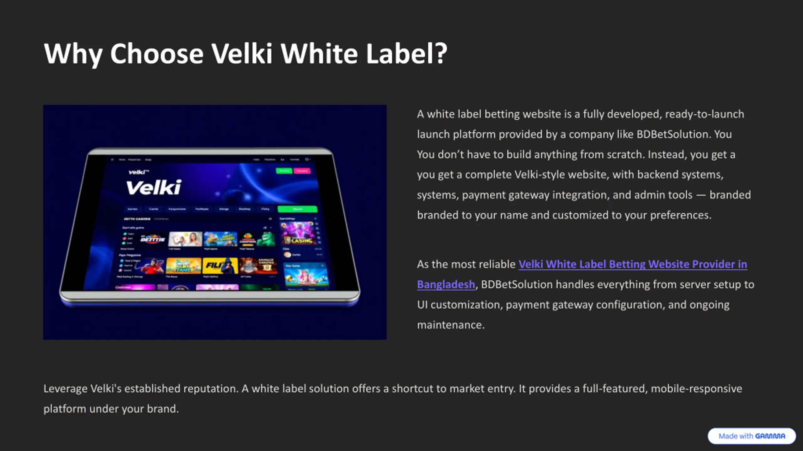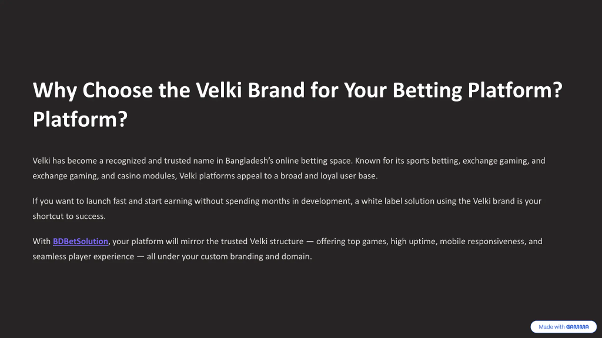 Why Choose Velki White Label? A white label betting website is a fully developed, ready-to- launch launch platform provided by a company like BDBetSolution. You You don t have to build anything from scratch. Instead, you get a you get a complete Velki-style website, with backend systems, systems, payment gateway integration, and admin tools branded branded to your name and customized to your preferences. As the most reliable Velki White Label Betting Website Provider in Bangladesh, BDBetSolution handles everything from server setup to UI customization, payment gateway configuration, and ongoing maintenance. Leverage Velki's established reputation. A white label solution offers a shortcut to market entry. It provides a full-featured, mobile-responsive platform under your brand. preencoded.png