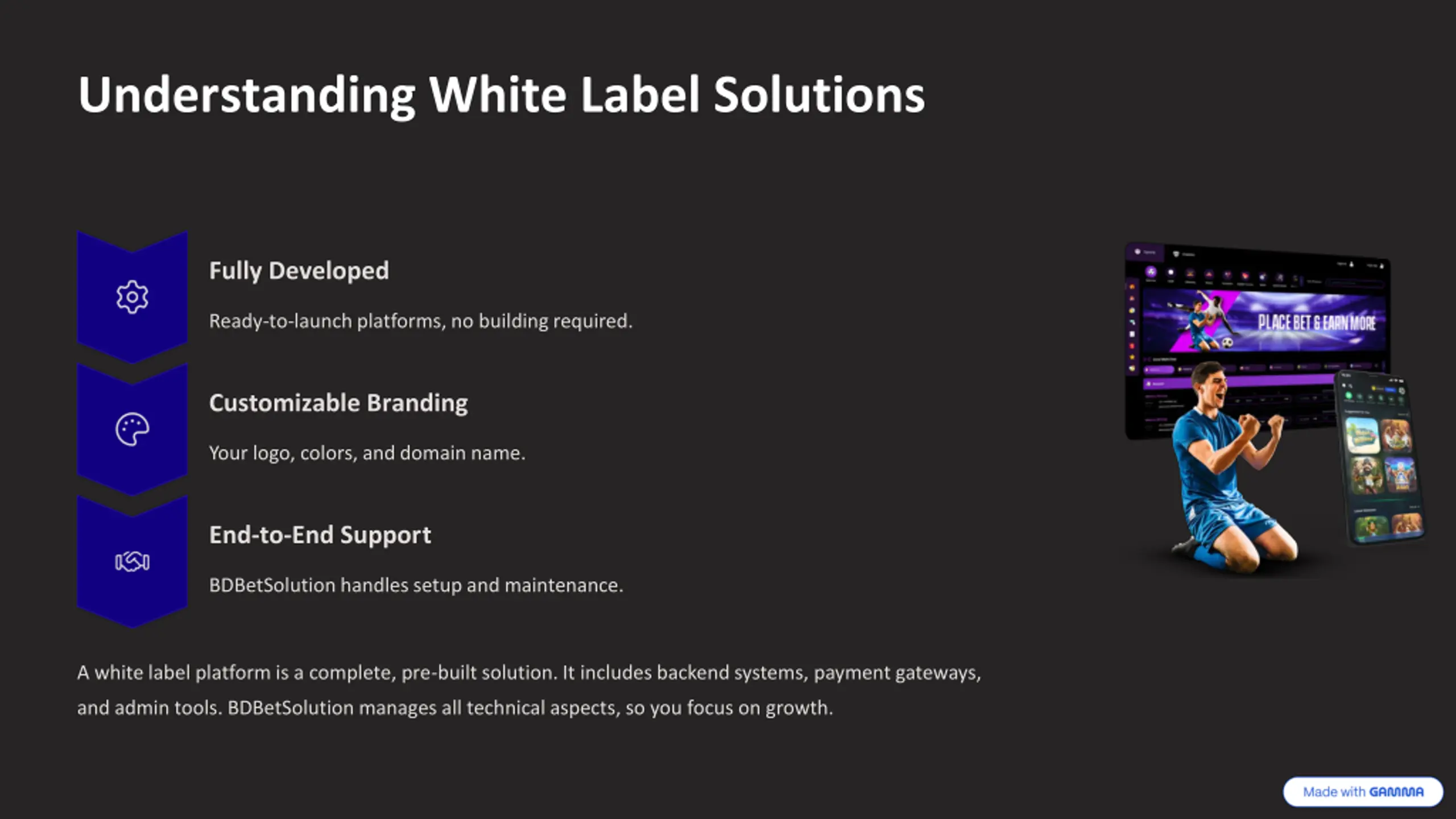 Understanding White Label Solutions Fully Developed Ready-to-launch platforms, no building required. Customizable Branding Your logo, colors, and domain name. End-to-End Support BDBetSolution handles setup and maintenance. A white label platform is a complete, pre-built solution. It includes backend systems, payment gateways, and admin tools. BDBetSolution manages all technical aspects, so you focus on growth. preencoded.png