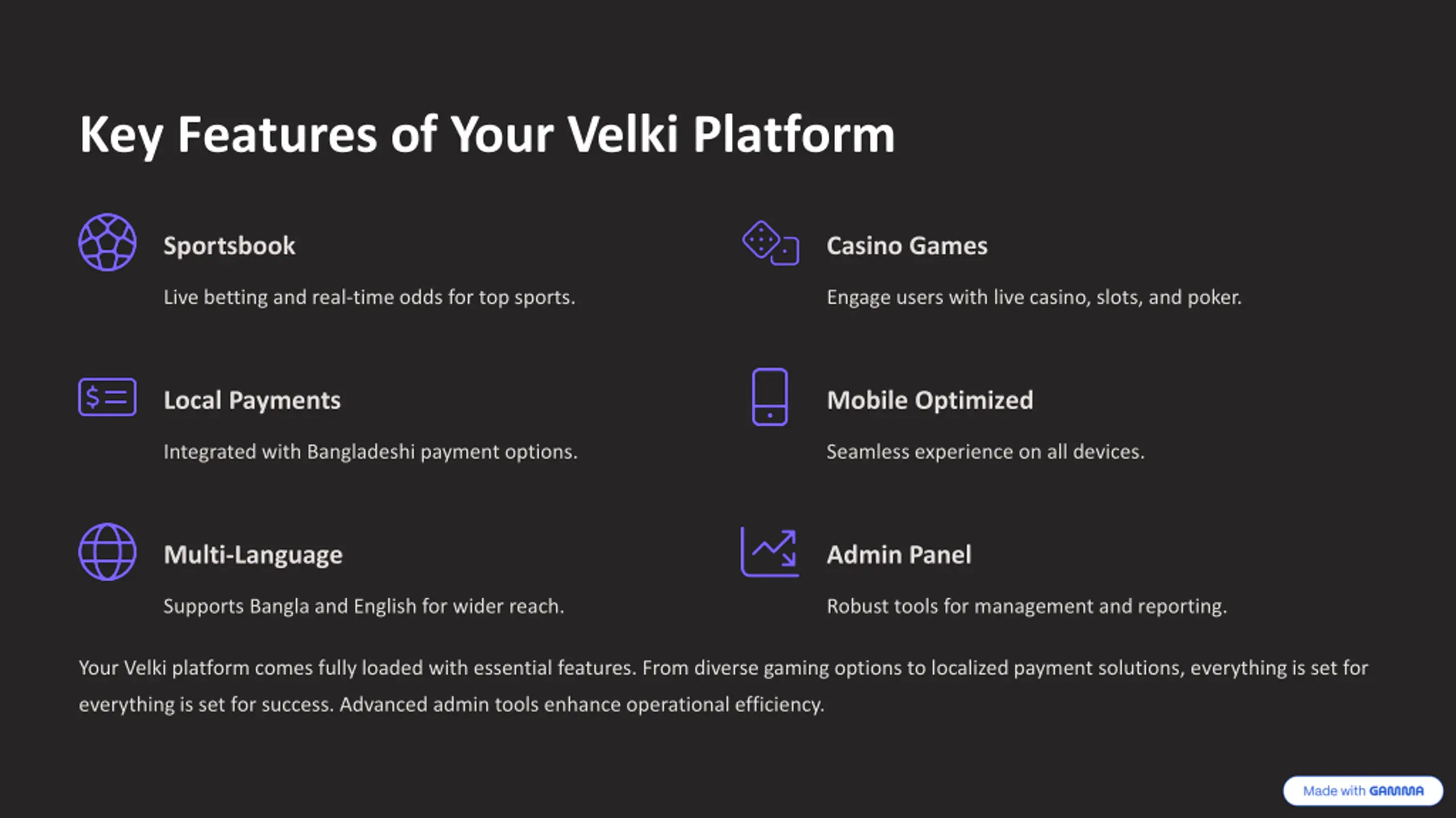 Key Features of Your Velki Platform Sportsbook Casino Games Live betting and real-time odds for top sports. Engage users with live casino, slots, and poker. Local Payments Mobile Optimized Integrated with Bangladeshi payment options. Seamless experience on all devices. Multi-Language Admin Panel Supports Bangla and English for wider reach. Robust tools for management and reporting. Your Velki platform comes fully loaded with essential features. From diverse gaming options to localized payment solutions, e verything is set for everything is set for success. Advanced admin tools enhance operational efficiency. preencoded.png