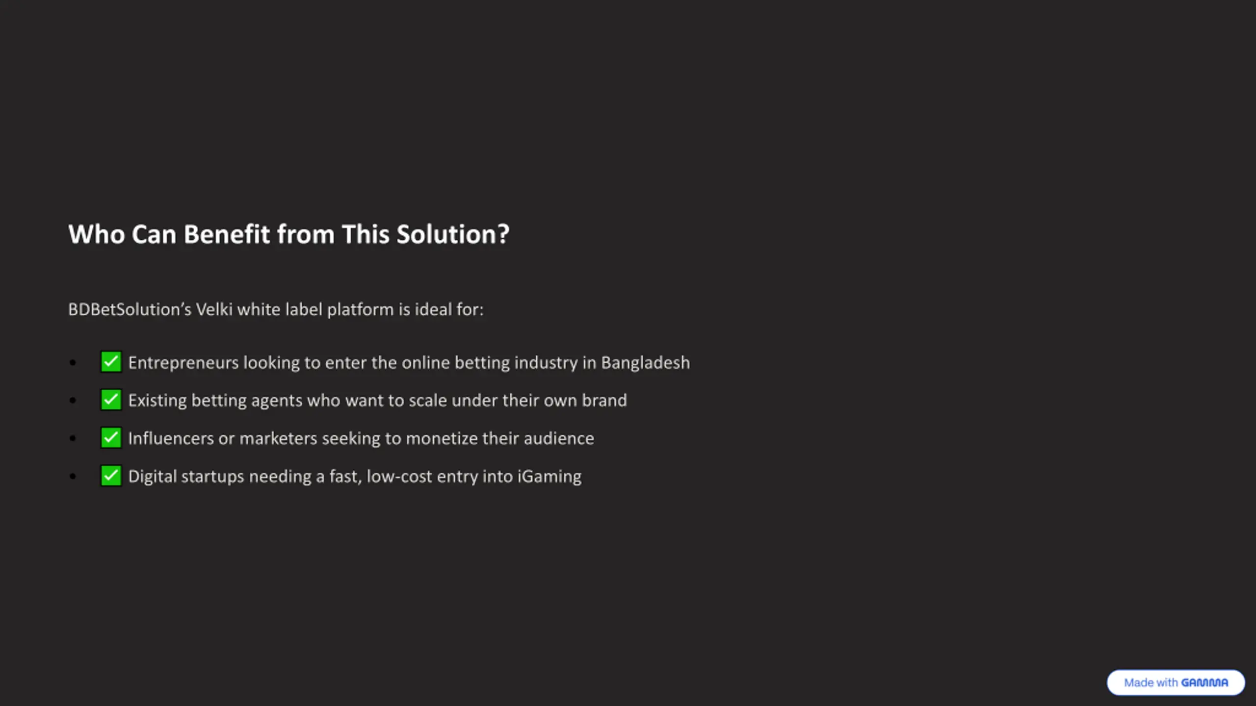 Who Can Benefit from This Solution? BDBetSolution s Velki white label platform is ideal for: Entrepreneurs looking to enter the online betting industry in Bangladesh Existing betting agents who want to scale under their own brand Influencers or marketers seeking to monetize their audience Digital startups needing a fast, low-cost entry into iGaming preencoded.png