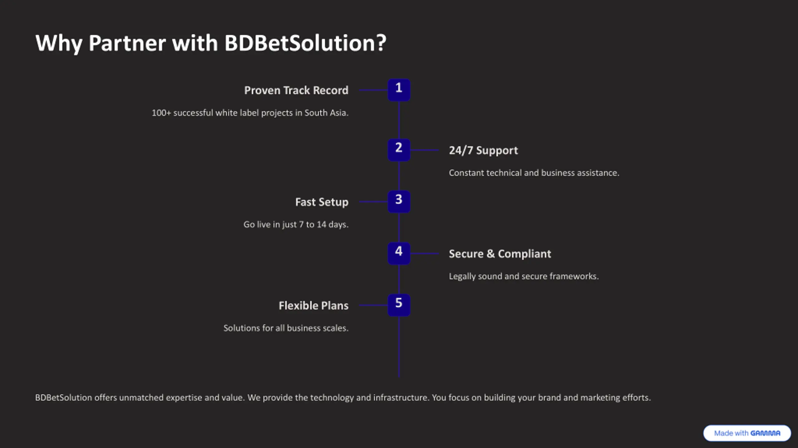 Why Partner with BDBetSolution? 1 Proven Track Record 100+ successful white label projects in South Asia. 2 24/7 Support Constant technical and business assistance. 3 Fast Setup Go live in just 7 to 14 days. 4 Secure & Compliant Legally sound and secure frameworks. 5 Flexible Plans Solutions for all business scales. BDBetSolution offers unmatched expertise and value. We provide the technology and infrastructure. You focus on building your brand and marketing efforts. preencoded.png