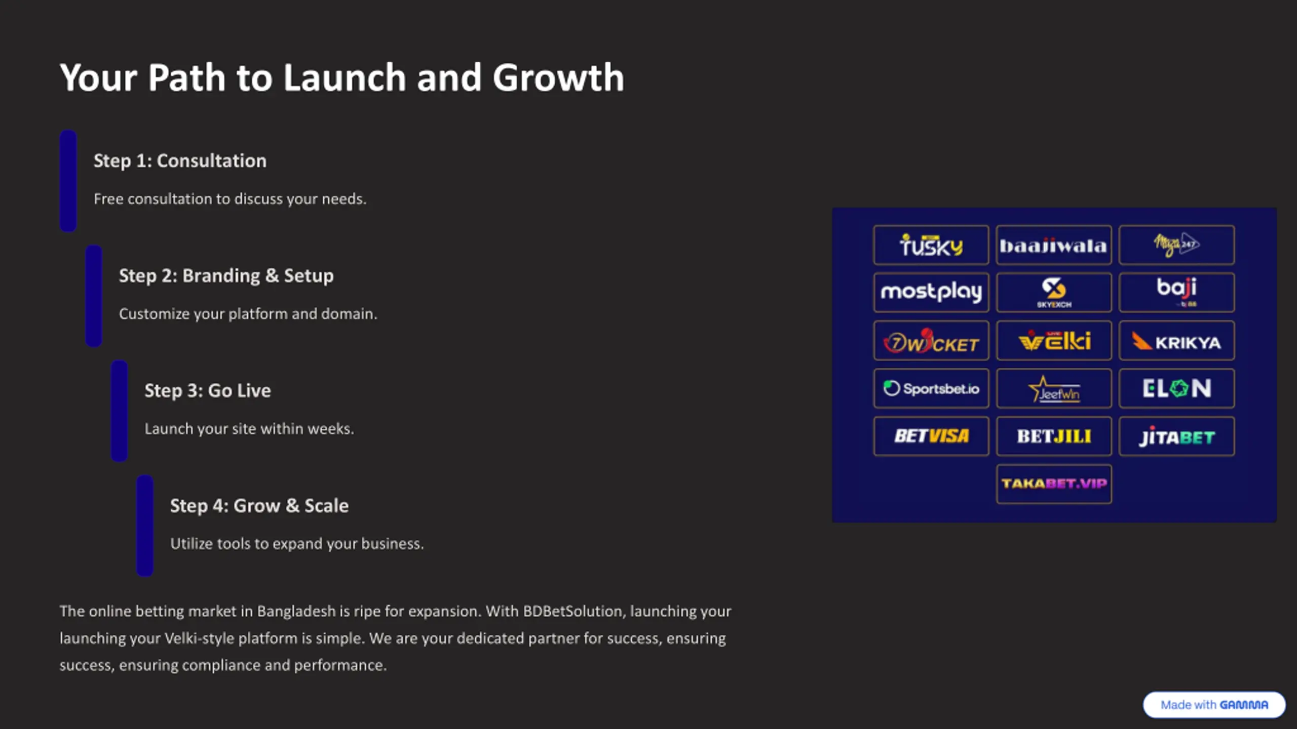 Your Path to Launch and Growth Step 1: Consultation Free consultation to discuss your needs. Step 2: Branding & Setup Customize your platform and domain. Step 3: Go Live Launch your site within weeks. Step 4: Grow & Scale Utilize tools to expand your business. The online betting market in Bangladesh is ripe for expansion. With BDBetSolution, launching your launching your Velki-style platform is simple. We are your dedicated partner for success, ensuring success, ensuring compliance and performance. preencoded.png