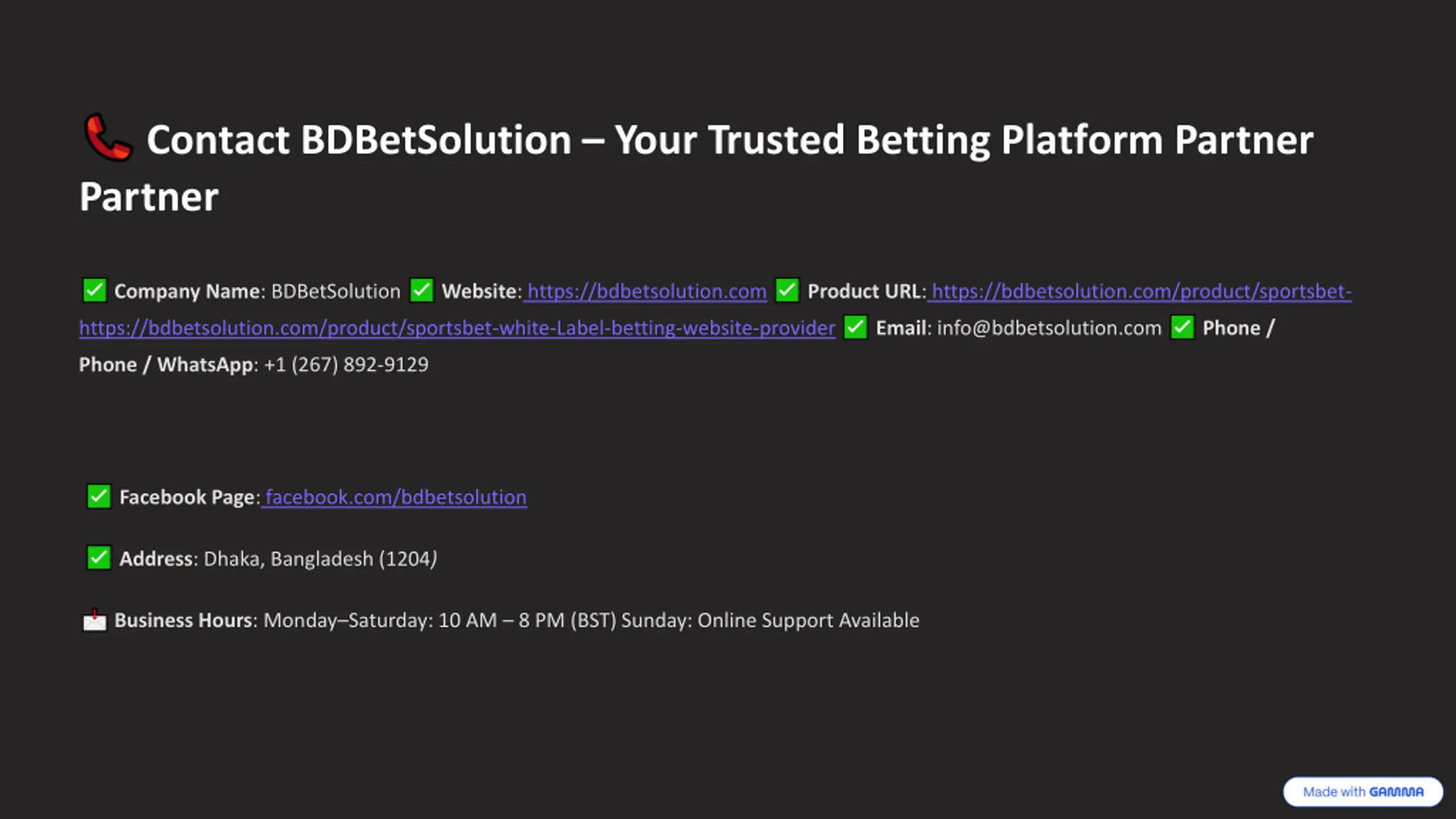 Contact BDBetSolution Your Trusted Betting Platform Partner Partner Company Name: BDBetSolution Website: https://bdbetsolution.com Product URL: https://bdbetsolution.com/product/sportsbet - https://bdbetsolution.com/product/sportsbet - white-Label-betting-website-provider Email: info@bdbetsolution.com Phone / Phone / WhatsApp : +1 (267) 892-9129 Facebook Page: facebook.com/bdbetsolution Address: Dhaka, Bangladesh (1204) Business Hours: Monday Saturday: 10 AM 8 PM (BST) Sunday: Online Support Available preencoded.png