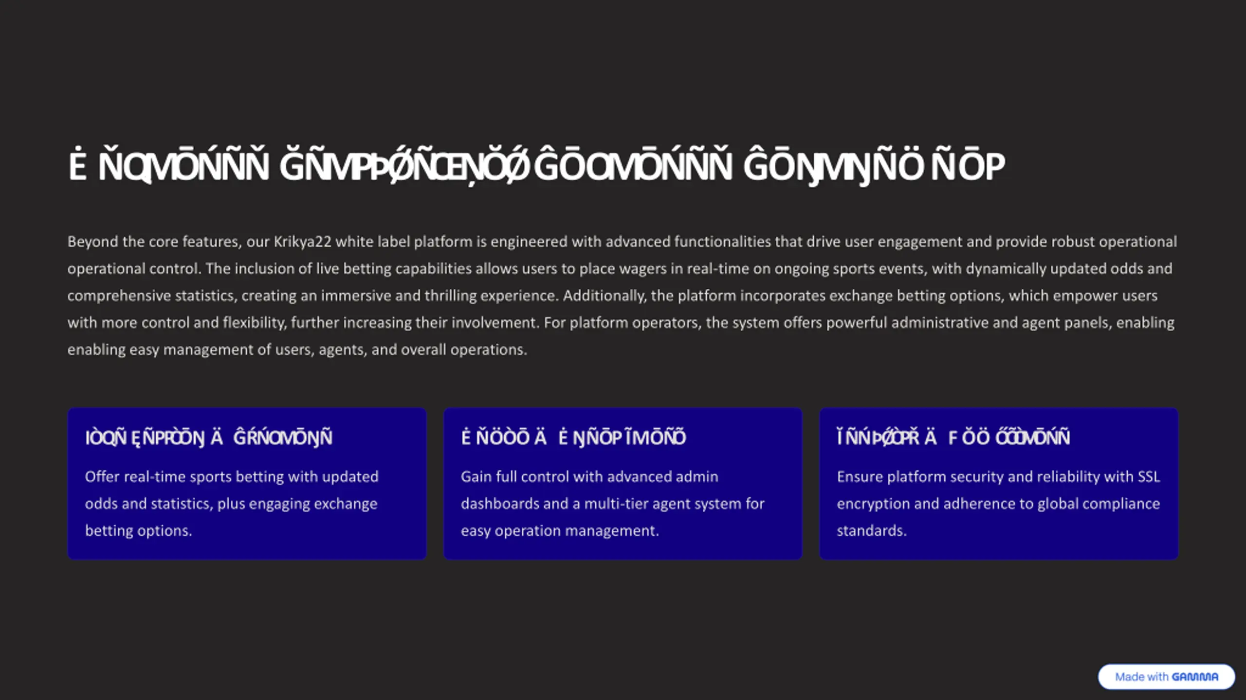 A dvanced Feature s for Enhanced Engagement Beyond the core features, our Krikya22 white label platform is engineered with advanced functionalities that drive user engagement and provide robust operational operational control. The inclusion of live betting capabilities allows users to place wagers in real-time on ongoing sports events, with dynamically updated odds and comprehensive statistics, creating an immersive and thrilling experience. Additionally, the platform incorporates exchange betting options, which empower users with more control and flexibility, further increasing their involvement. For platform operators, the system offers powerful administrative and agent panels, enabling enabling easy management of users, agents, and overall operations. Live Bett i ng & Exchange Admin & Agent Pane l Secur i ty & Com pl i a nce Offer real-time sports betting with updated Gain full control with advanced admin Ensure platform security and reliability with SSL odds and statistics, plus engaging exchange dashboards and a multi-tier agent system for encryption and adherence to global compliance betting options. easy operation management. standards. preencoded.png