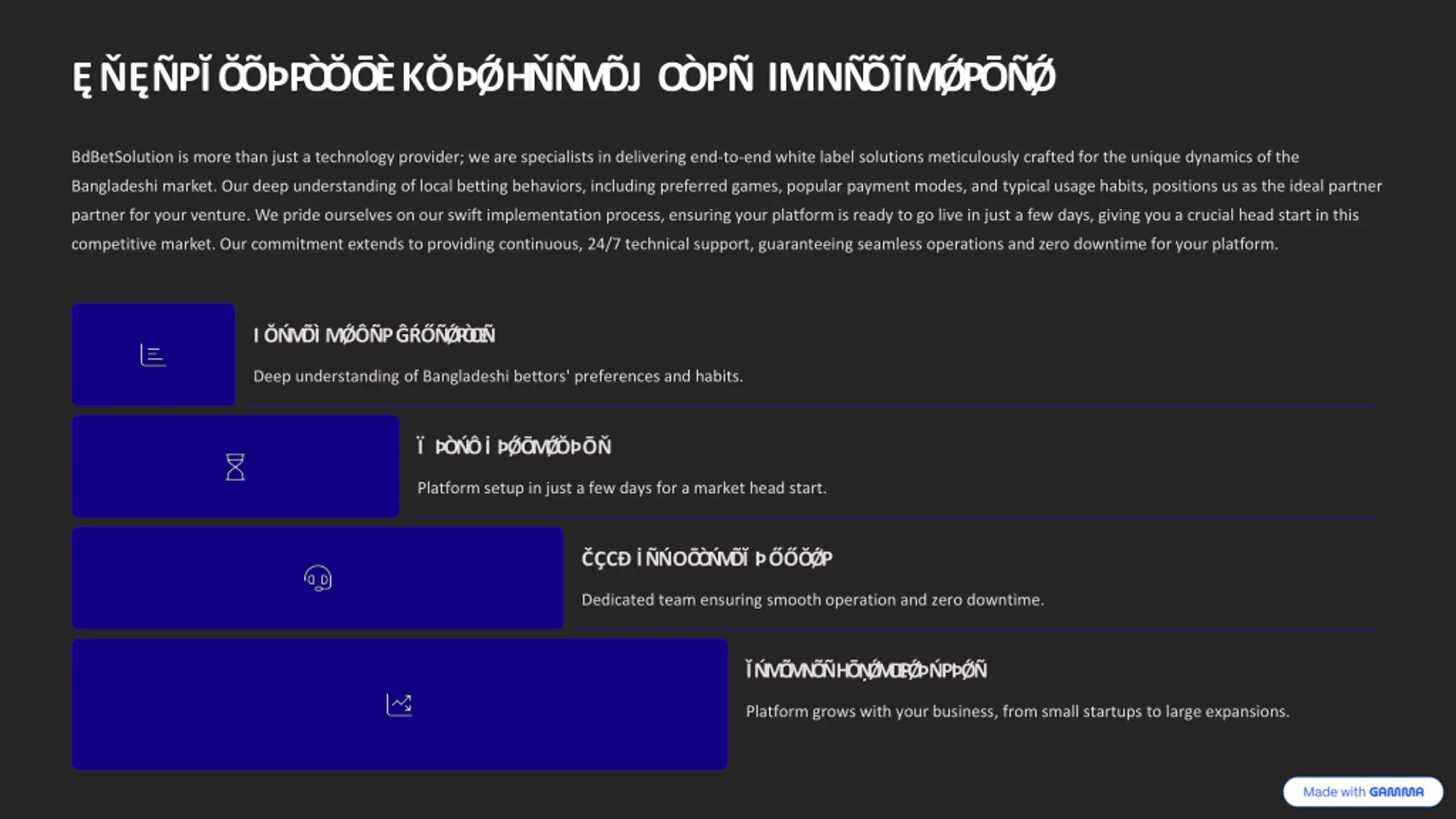 BdBetSo lut i on: Your Idea l W h ite Labe l Partner BdBetSolution is more than just a technology provider; we are specialists in delivering end-to-end white label solutions meticulously crafted for the unique dynamics of the Bangladeshi market. Our deep understanding of local betting behaviors, including preferred games, popular payment modes, and typical usage habits, positions us as the ideal partner partner for your venture. We pride ourselves on our swift implementation process, ensuring your platform is ready to go live in just a few days, giving you a crucial head start in this competitive market. Our commitment extends to providing continuous, 24/7 technical support, guaranteeing seamless operations and zero downtime for your platform. L oca l M arket Expert i s e Deep understanding of Bangladeshi bettors' preferences and habits. Q uick T urna r ound Platform setup in just a few days for a market head start. 24/7 Techn i c a l S upport Dedicated team ensuring smooth operation and zero downtime. Sca l a bl e Inf r a s t r ucture Platform grows with your business, from small startups to large expansions. preencoded.png