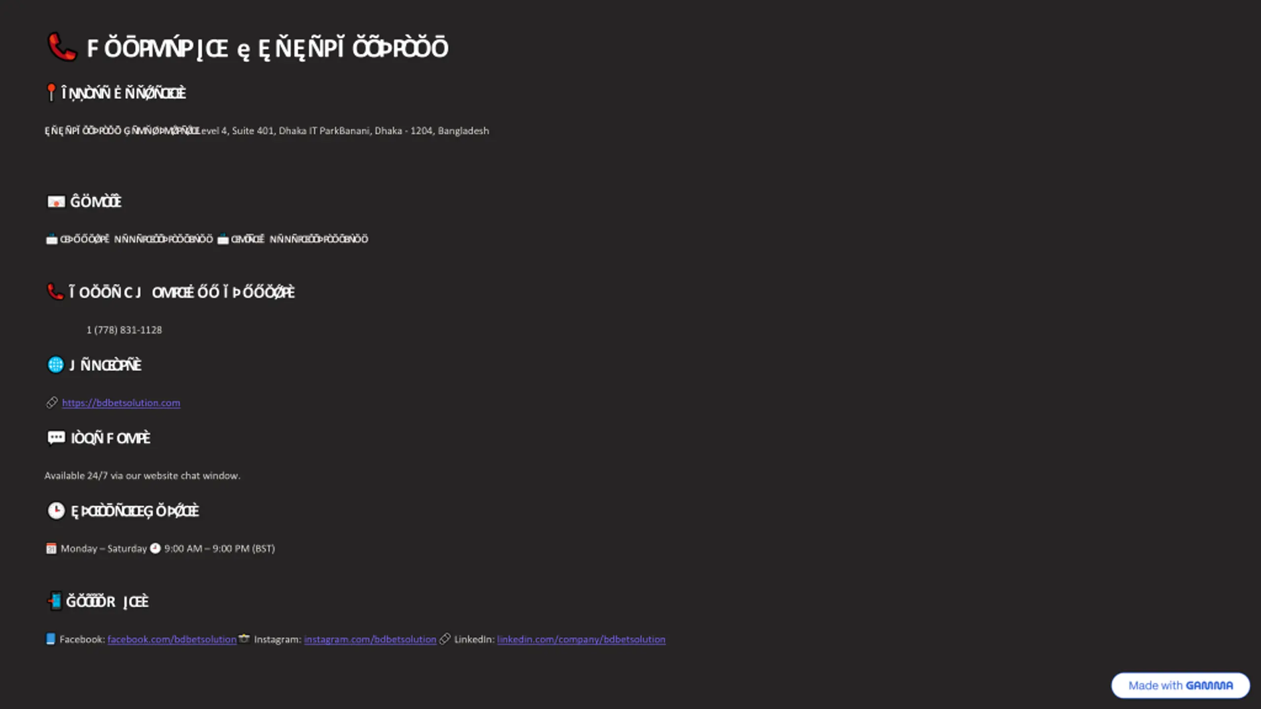 Conta ct Us BdBetS olut i on Off i ce Addre s s : BdBetS olut i on Headquarter s Level 4, Suite 401, Dhaka IT ParkBanani, Dhaka - 1204, Bangladesh Ema i l : support@ bdbet s o l ut i on.com s a l e s @ bdbet s o l ut i on.com P hone / W hat s App S upport: 1 (778) 831-1128 W ebs i te: https://bdbetsolution.com Live Chat: Available 24/7 via our website chat window. Bus i ne s s Hour s : Monday Saturday 9:00 AM 9:00 PM (BST) Fo l l ow Us: Facebook: facebook.com/bdbetsolution Instagram: instagram.com/bdbetsolution LinkedIn: linkedin.com/company/bdbetsolution preencoded.png