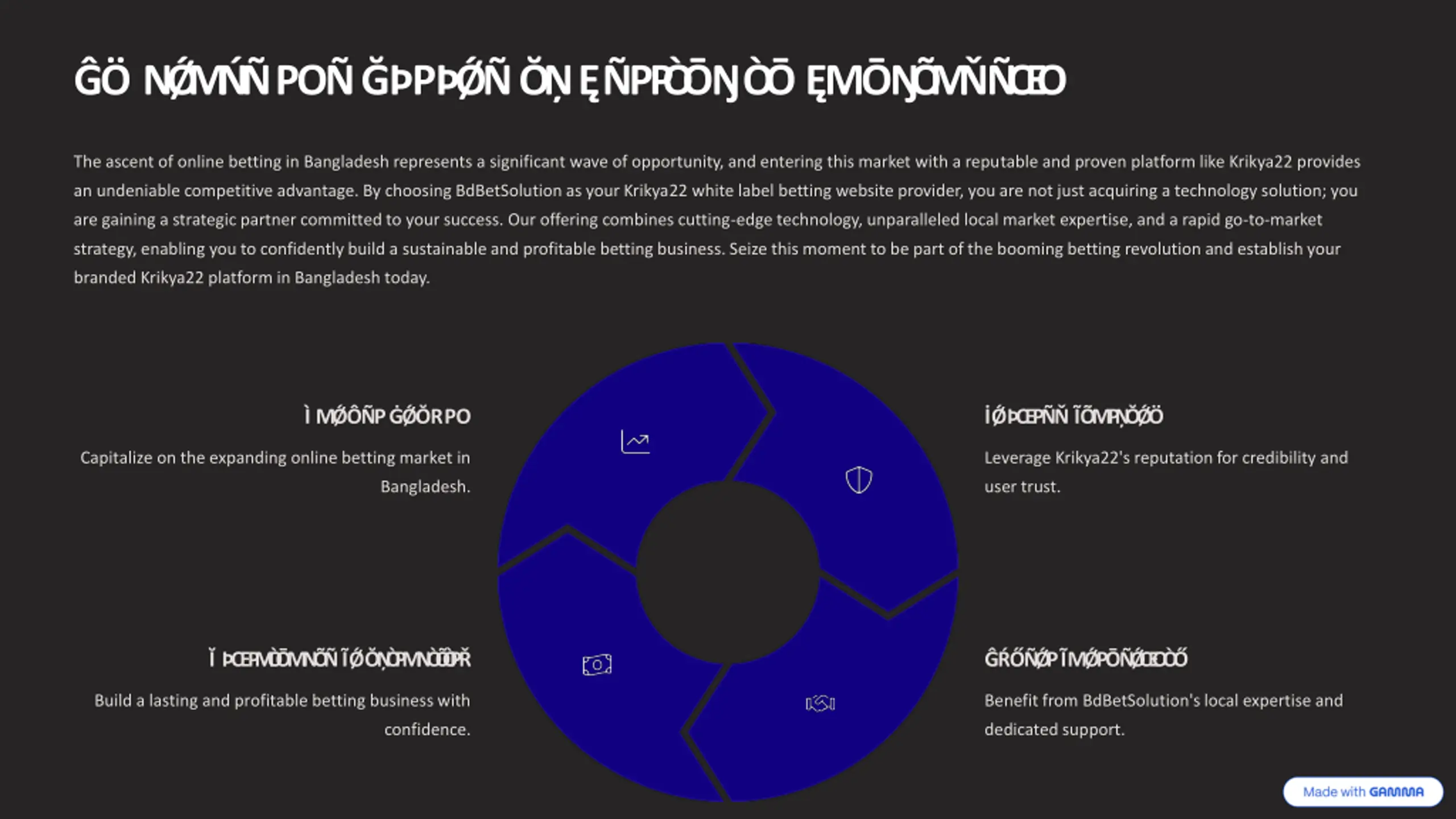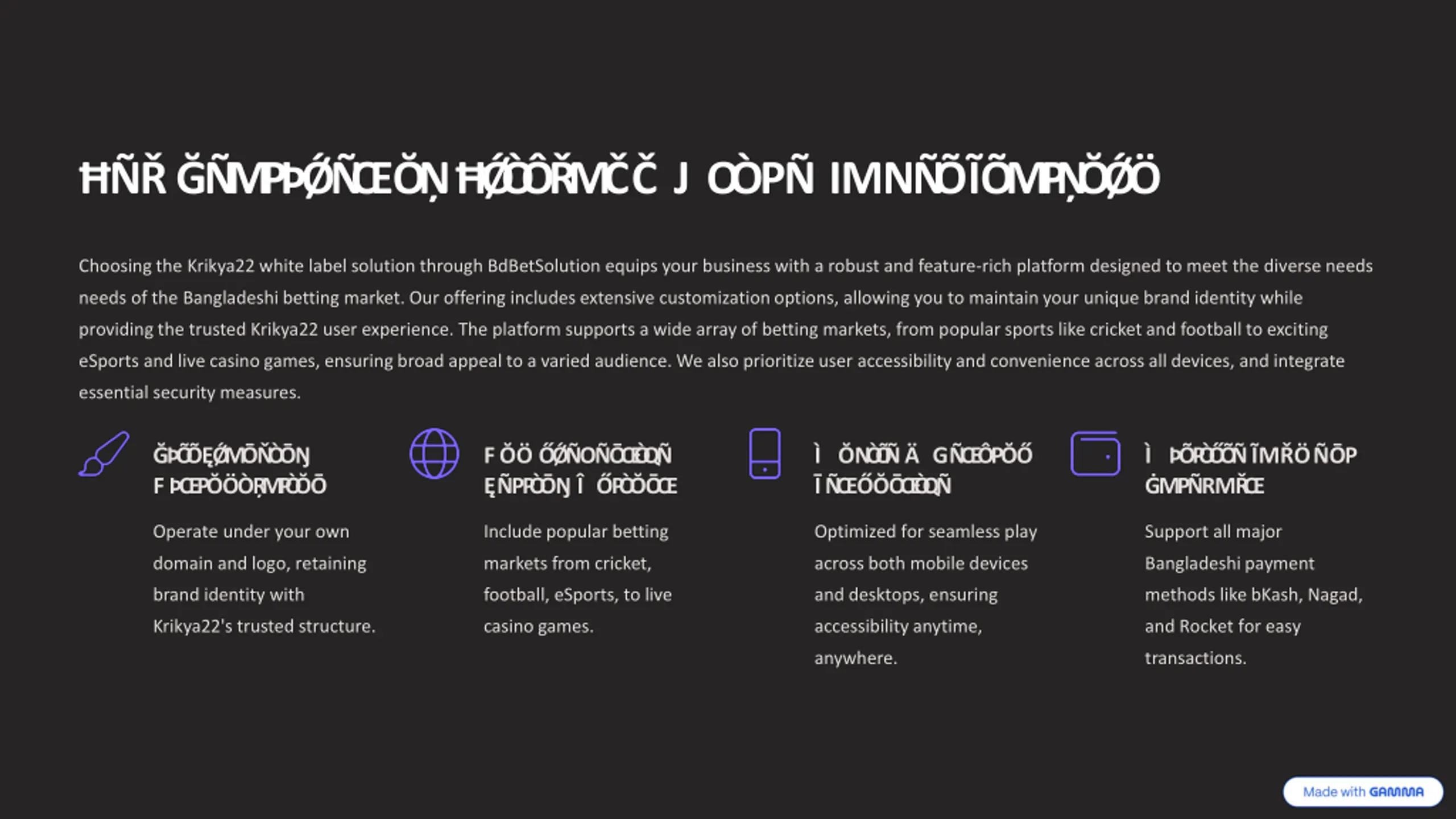 Key Feature s of Kr i kya22 W hite Labe l Plat f orm Choosing the Krikya22 white label solution through BdBetSolution equips your business with a robust and feature-rich platform designed to meet the diverse needs needs of the Bangladeshi betting market. Our offering includes extensive customization options, allowing you to maintain your unique brand identity while providing the trusted Krikya22 user experience. The platform supports a wide array of betting markets, from popular sports like cricket and football to exciting eSports and live casino games, ensuring broad appeal to a varied audience. We also prioritize user accessibility and convenience across all devices, and integrate essential security measures. Ful l Brand i ng Customizat i on Com prehen s i ve Bett i ng O pt i on s M obi l e & Desktop Respon s i ve M ult i p l e Payment Gateway s Operate under your own Include popular betting Optimized for seamless play Support all major domain and logo, retaining markets from cricket, across both mobile devices Bangladeshi payment brand identity with football, eSports, to live and desktops, ensuring methods like bKash, Nagad, Krikya22's trusted structure. casino games. accessibility anytime, and Rocket for easy anywhere. transactions. preencoded.png