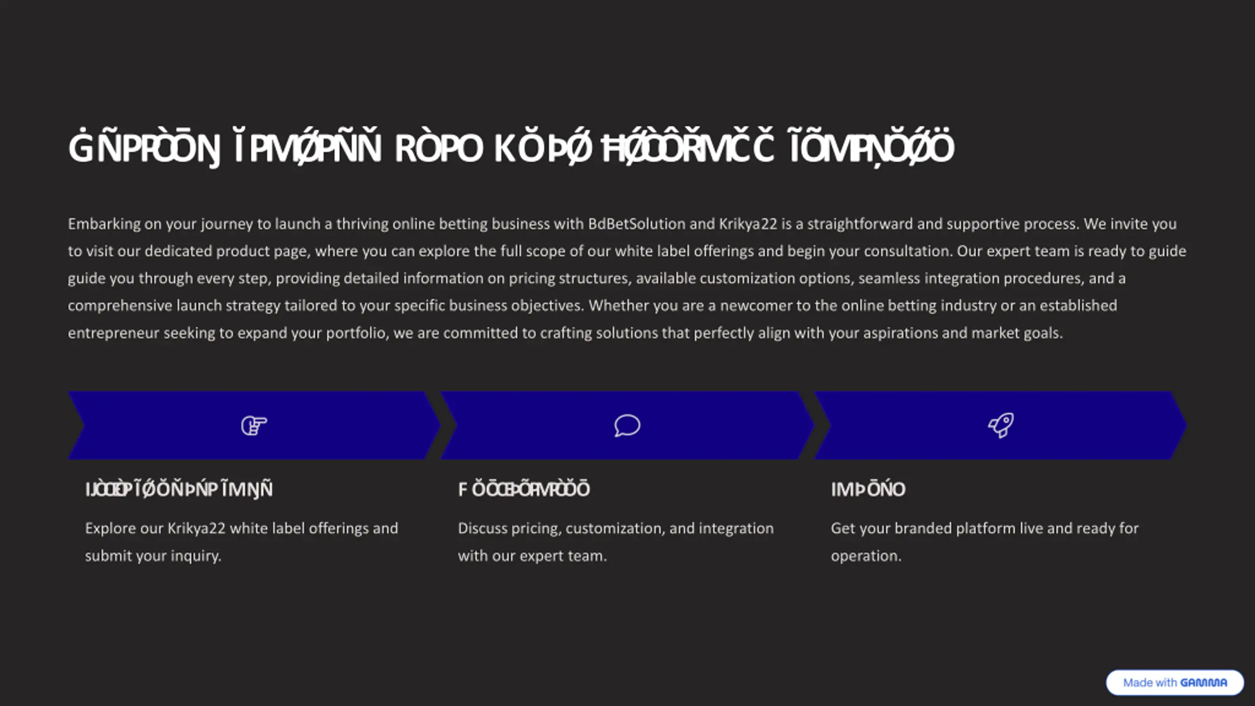 Gett i ng Started with Your Kr i kya22 Plat f orm Embarking on your journey to launch a thriving online betting business with BdBetSolution and Krikya22 is a straightforward and supportive process. We invite you to visit our dedicated product page, where you can explore the full scope of our white label offerings and begin your consultation. Our expert team is ready to guide guide you through every step, providing detailed information on pricing structures, available customization options, seamless integration procedures, and a comprehensive launch strategy tailored to your specific business objectives. Whether you are a newcomer to the online betting industry or an established entrepreneur seeking to expand your portfolio, we are committed to crafting solutions that perfectly align with your aspirations and market goals. Vi s i t Product Page Con s ult a t i on Launch Explore our Krikya22 white label offerings and Discuss pricing, customization, and integration Get your branded platform live and ready for submit your inquiry. with our expert team. operation. preencoded.png