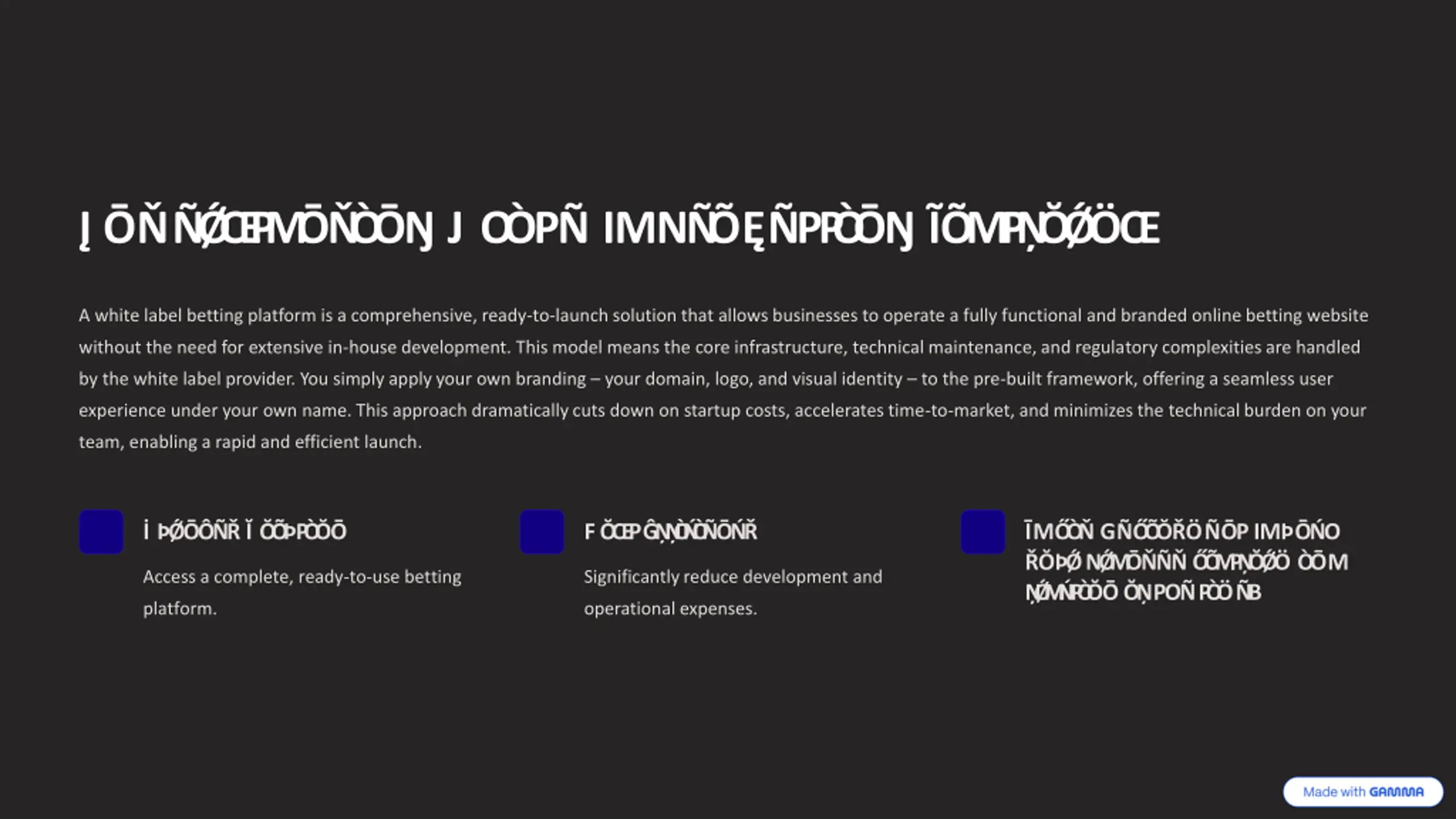 U nder s t a nd i ng W hite Labe l Bett i ng Plat f orms A white label betting platform is a comprehensive, ready-to-launch solution that allows businesses to operate a fully functional and branded online betting website without the need for extensive in-house development. This model means the core infrastructure, technical maintenance, and regulatory complexities are handled by the white label provider. You simply apply your own branding your domain, logo, and visual identity to the pre-built framework, offering a seamless user experience under your own name. This approach dramatically cuts down on startup costs, accelerates time-to-market, and minimizes the technical burden on your team, enabling a rapid and efficient launch. T urnkey S olut i on Cost Ef f i c i ency Rapid Dep l oyment Launch your br a nded p l a t f orm in a f r a ct i on of the t i me. Access a complete, ready-to-use betting Significantly reduce development and platform. operational expenses. preencoded.png