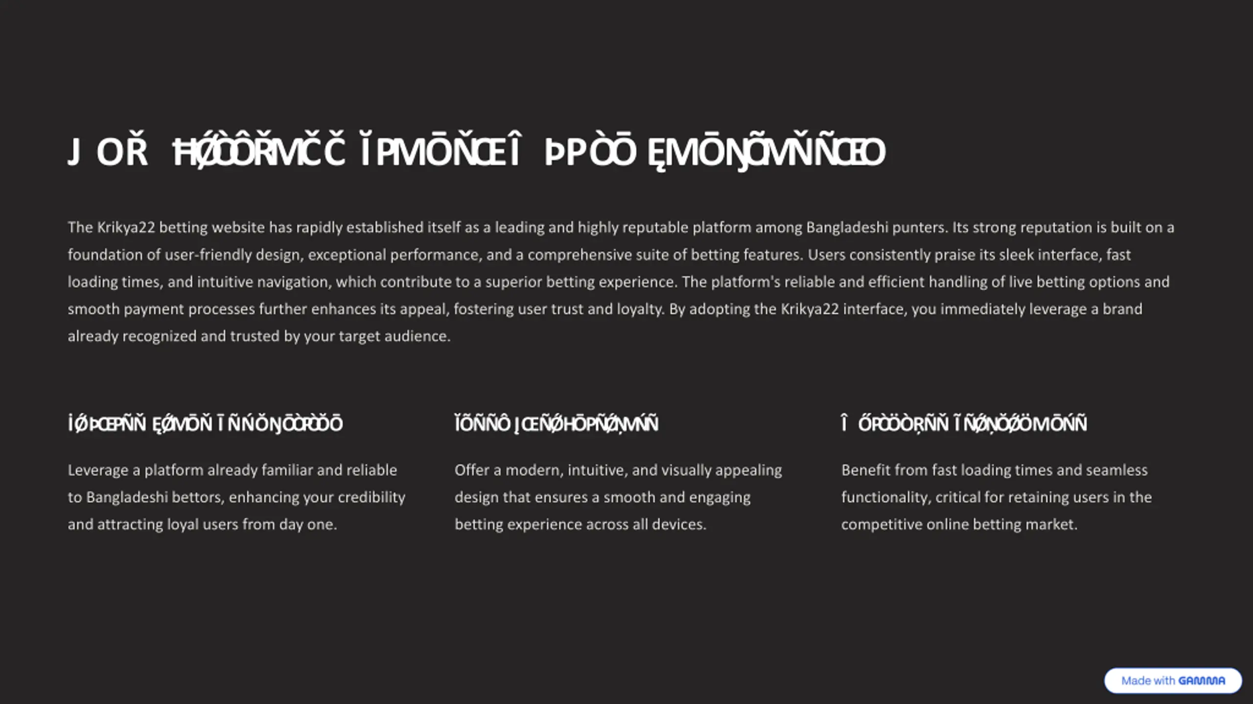 W hy Kr i kya22 Stand s O ut in Bangl a de s h The Krikya22 betting website has rapidly established itself as a leading and highly reputable platform among Bangladeshi punters. Its strong reputation is built on a foundation of user-friendly design, exceptional performance, and a comprehensive suite of betting features. Users consistently praise its sleek interface, fast loading times, and intuitive navigation, which contribute to a superior betting experience. The platform's reliable and efficient handling of live betting options and smooth payment processes further enhances its appeal, fostering user trust and loyalty. By adopting the Krikya22 interface, you immediately leverage a brand already recognized and trusted by your target audience. Trusted Brand Recogn i t i on Sleek User Inter f a ce O pt i mized Performance Leverage a platform already familiar and reliable Offer a modern, intuitive, and visually appealing Benefit from fast loading times and seamless to Bangladeshi bettors, enhancing your credibility design that ensures a smooth and engaging functionality, critical for retaining users in the and attracting loyal users from day one. betting experience across all devices. competitive online betting market. preencoded.png