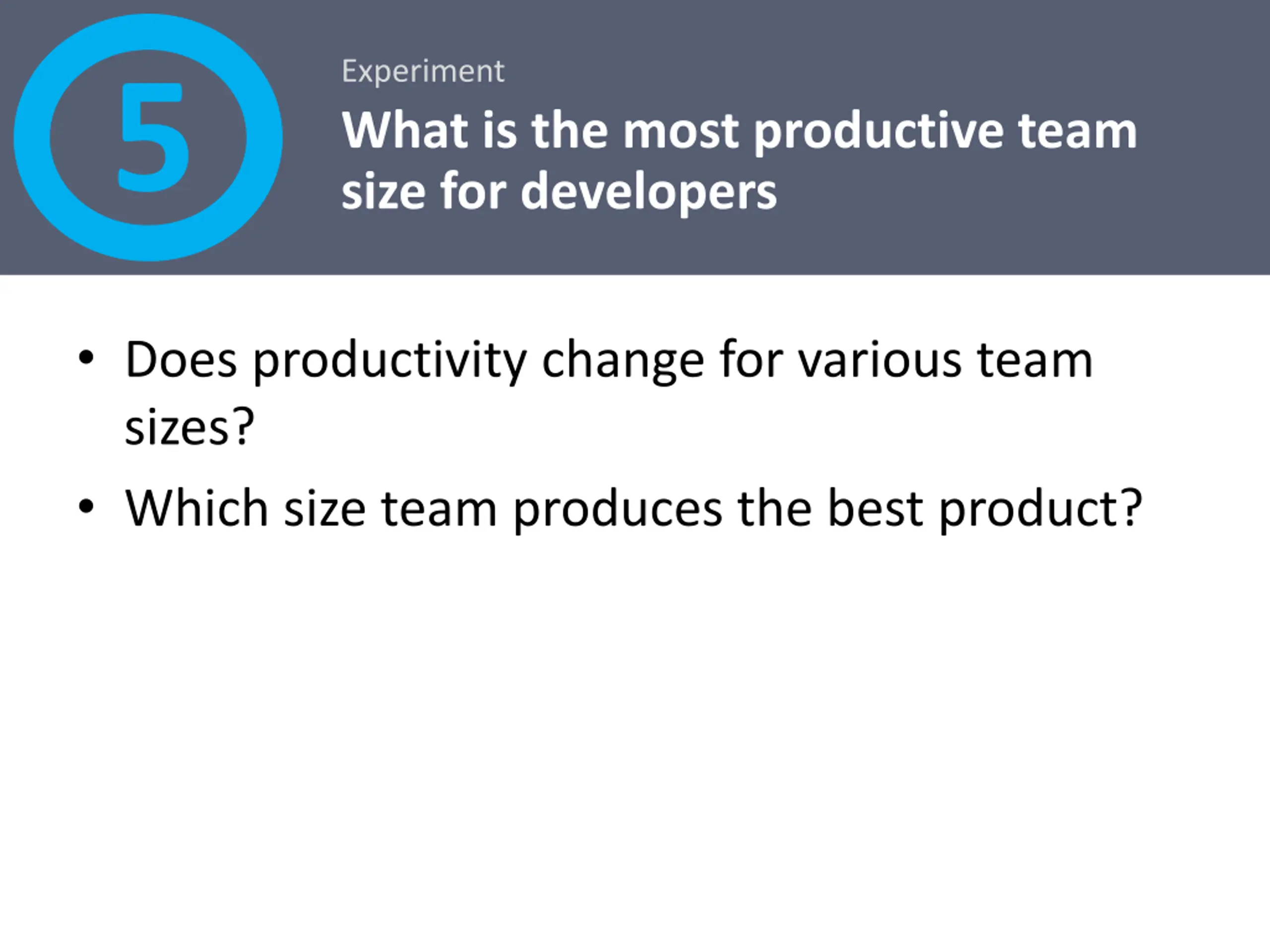 Experiment What is the most productive team size for developers 5 Does productivity change for various team sizes? Which size team produces the best product?