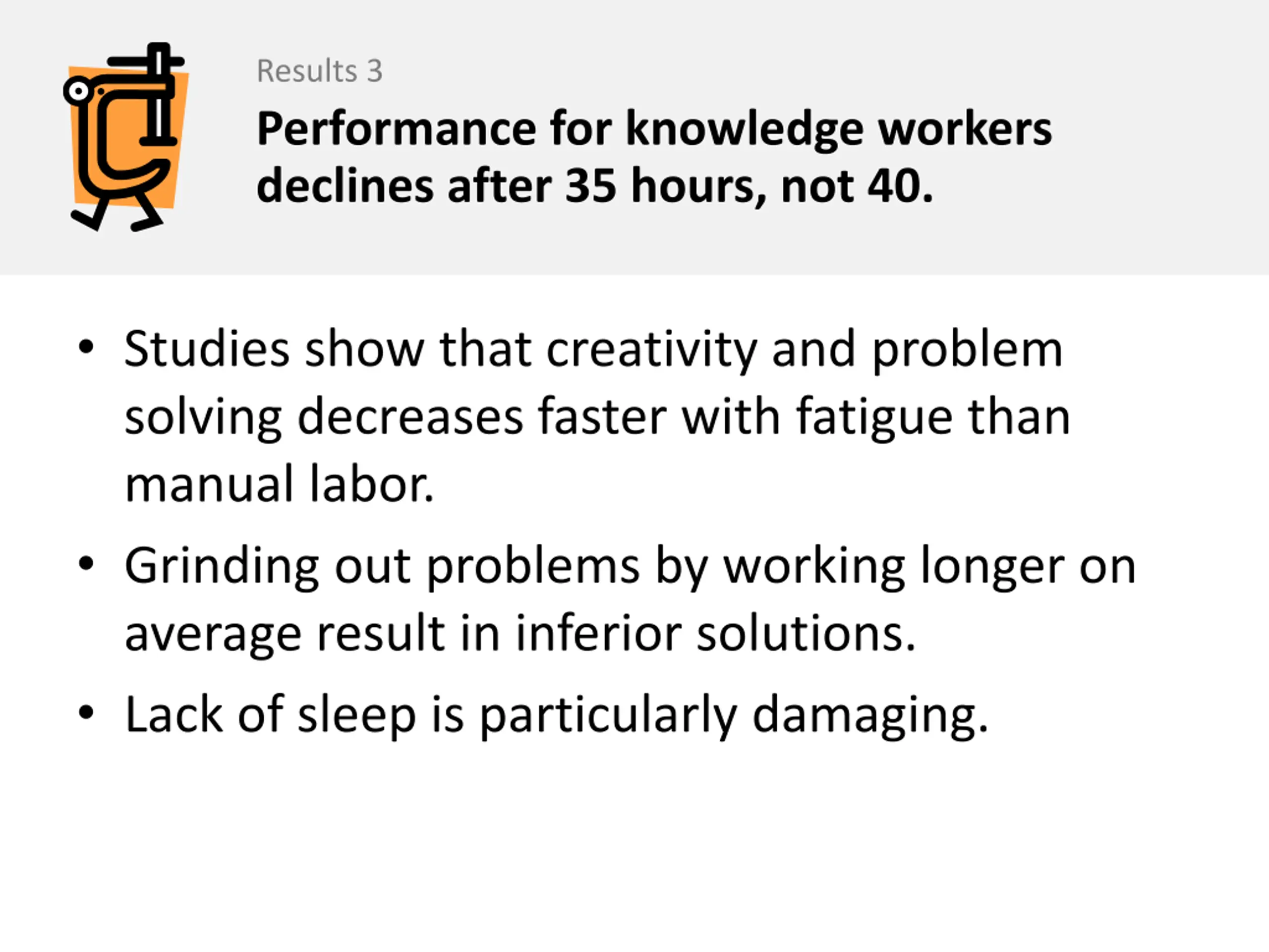 Results 3 Performance for knowledge workers declines after 35 hours, not 40. Studies show that creativity and problem solving decreases faster with fatigue than manual labor. Grinding out problems by working longer on average result in inferior solutions. Lack of sleep is particularly damaging.