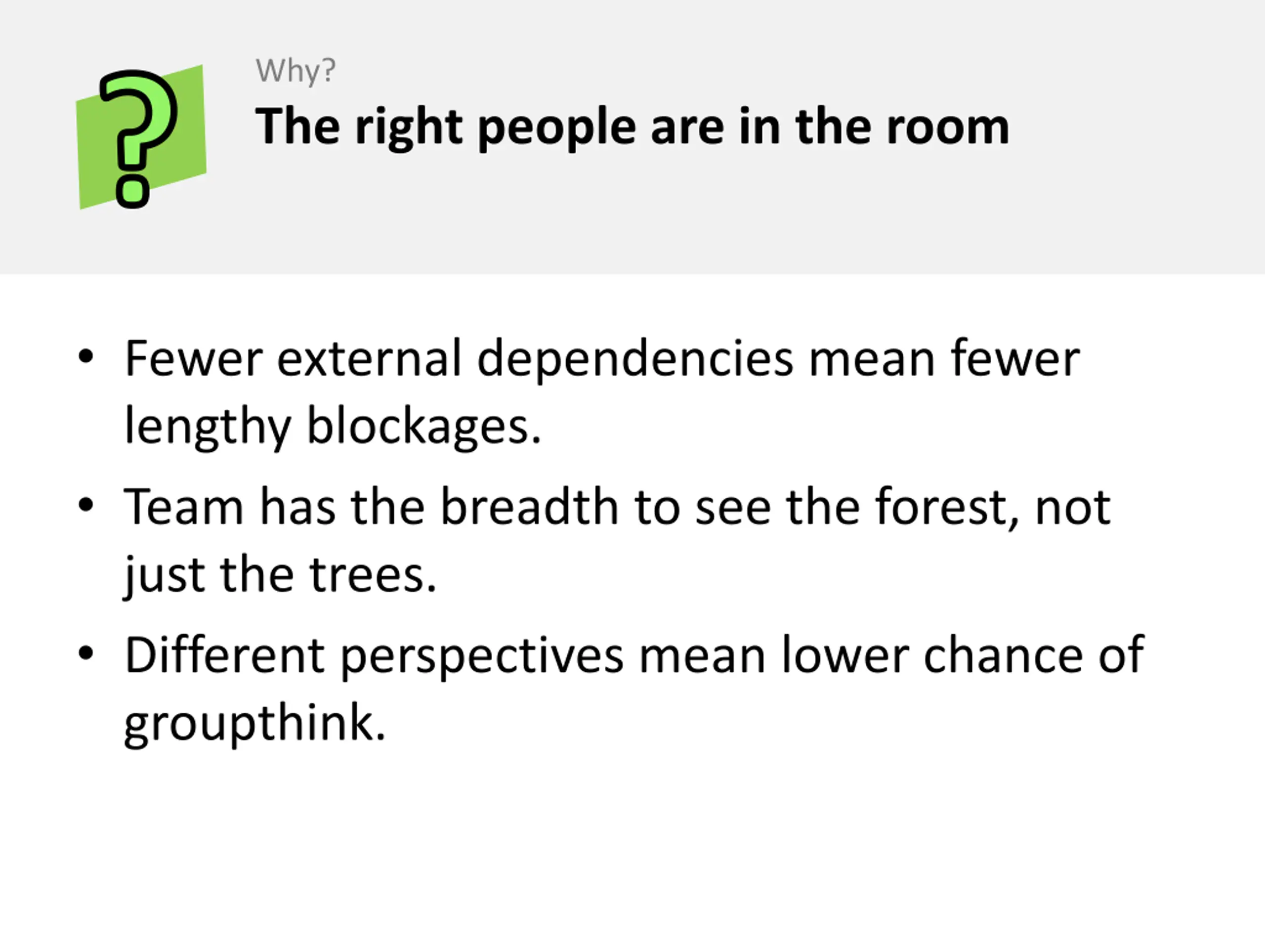 Why? The right people are in the room ? Fewer external dependencies mean fewer lengthy blockages. Team has the breadth to see the forest, not just the trees. Different perspectives mean lower chance of groupthink.