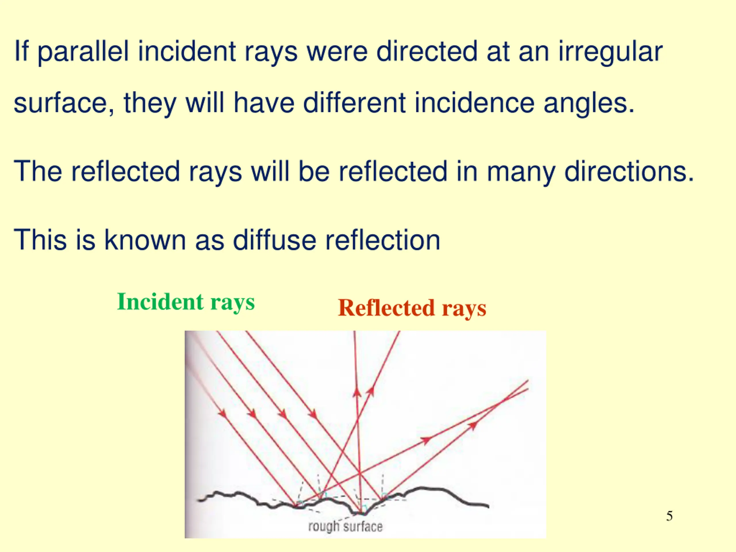 If parallel incident rays were directed at an irregular surface, they will have different incidence angles. The reflected rays will be reflected in many directions. This is known as diffuse reflection Incident rays Reflected rays 5