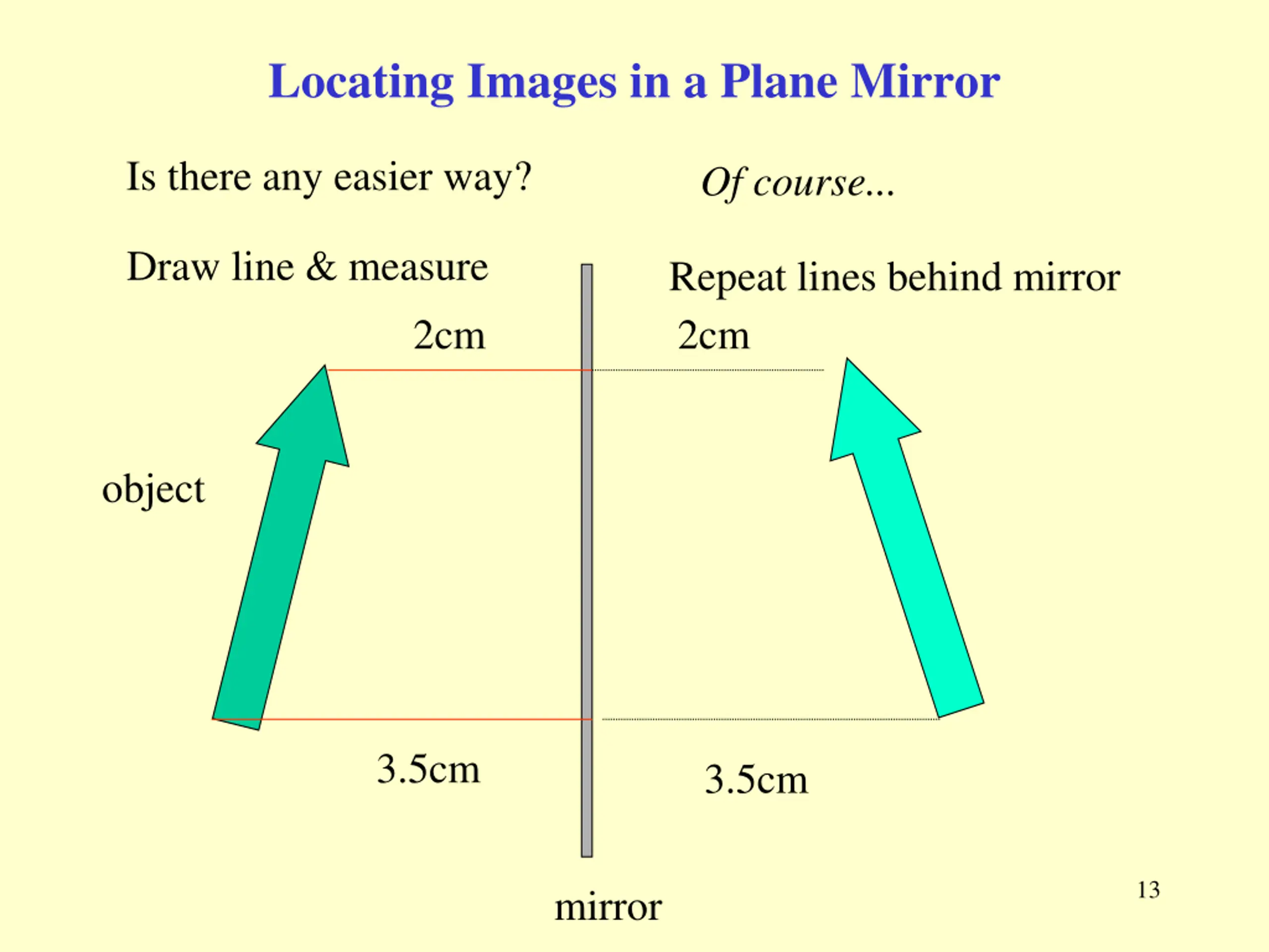 Locating Images in a Plane Mirror Is there any easier way? Of course... Draw line & measure Repeat lines behind mirror 2cm 2cm object 3.5cm 3.5cm 13 mirror