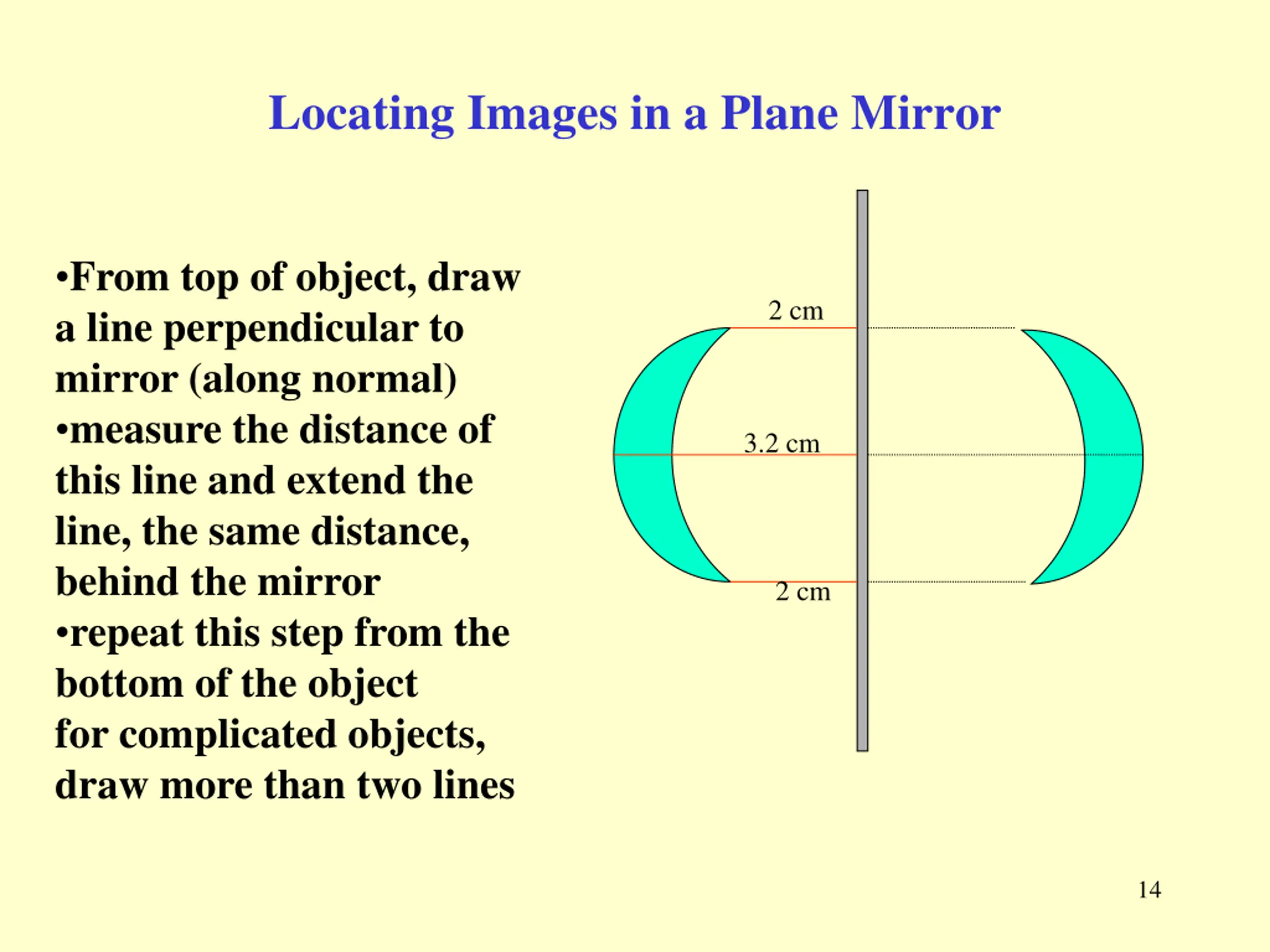 Locating Images in a Plane Mirror From top of object, draw a line perpendicular to mirror (along normal) measure the distance of this line and extend the line, the same distance, behind the mirror repeat this step from the bottom of the object for complicated objects, draw more than two lines 2 cm 3.2 cm 2 cm 14