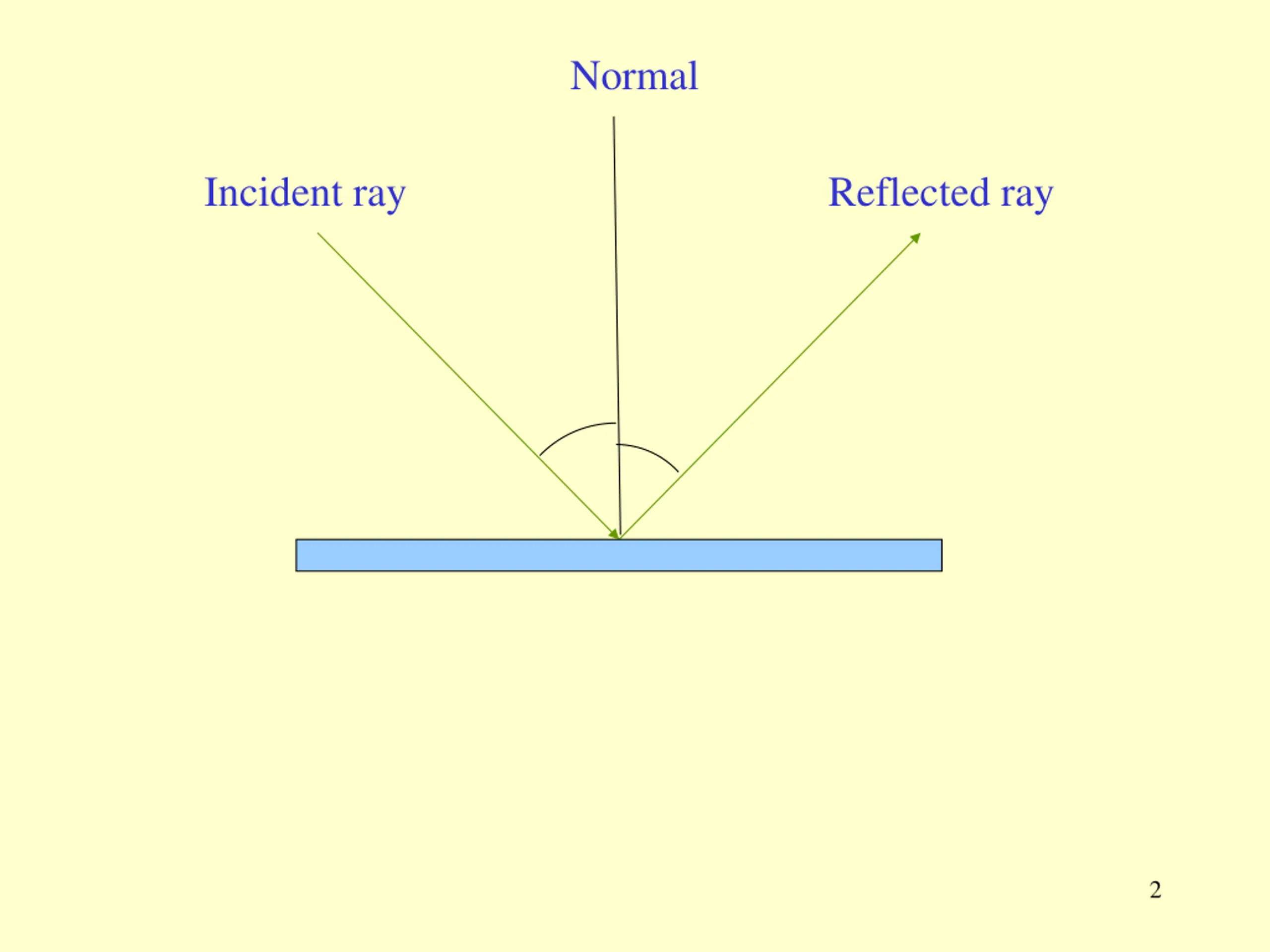 Laws of Reflection From the Activity you performed, when you shine an incident light ray at a plane mirror, the light is reflected off the mirror and forms a reflected ray. This behaviour leads to the 2 laws of reflection 1. The angle of incidence is equal to the angle of reflection 2. The incident ray, the reflected ray, and the normal all lie in the same plane. 1
