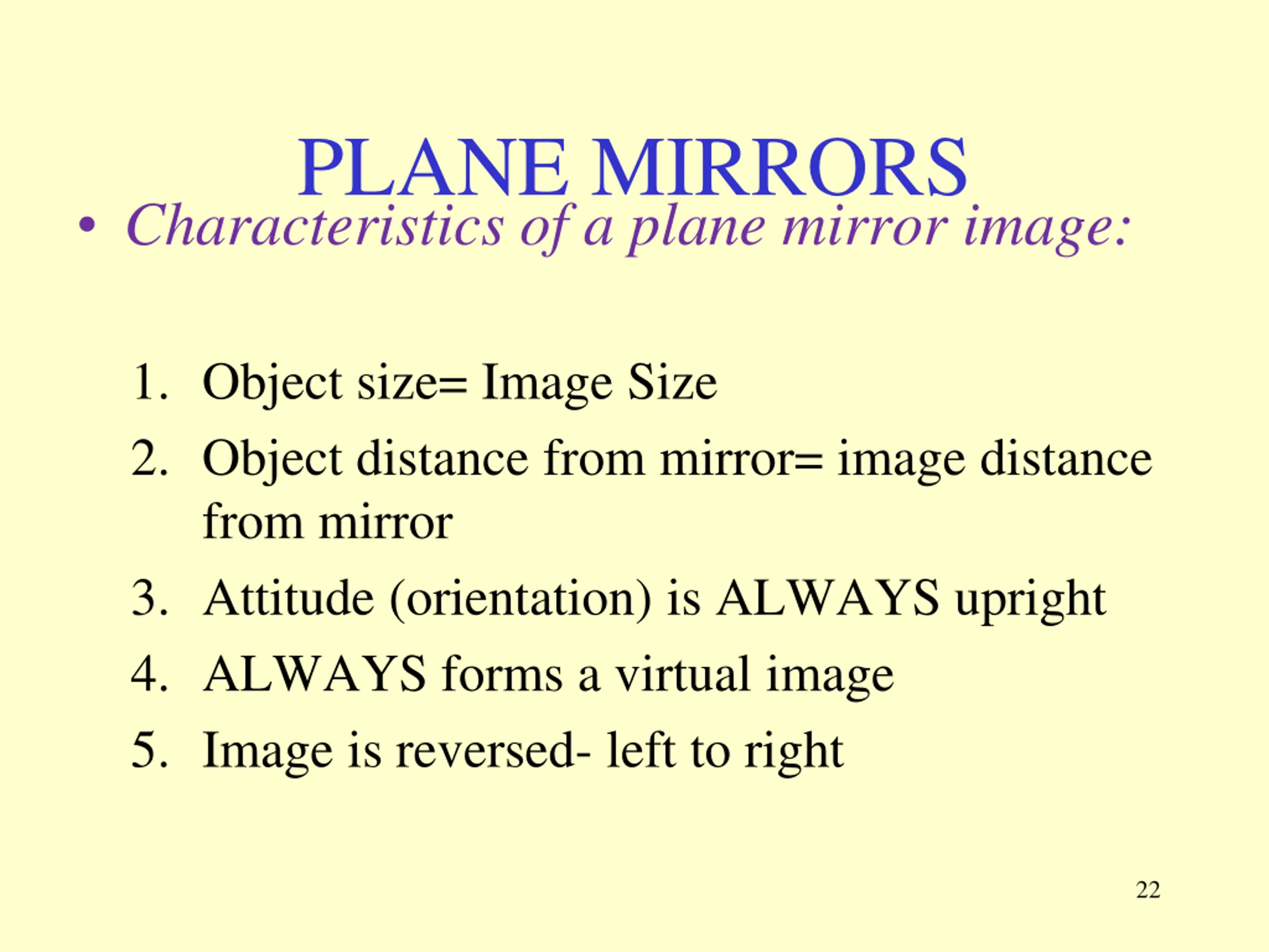 PLANE MIRRORS Characteristics of a plane mirror image: 1. Object size= Image Size 2. Object distance from mirror= image distance from mirror 3. Attitude (orientation) is ALWAYS upright 4. ALWAYS forms a virtual image 5. Image is reversed- left to right 22