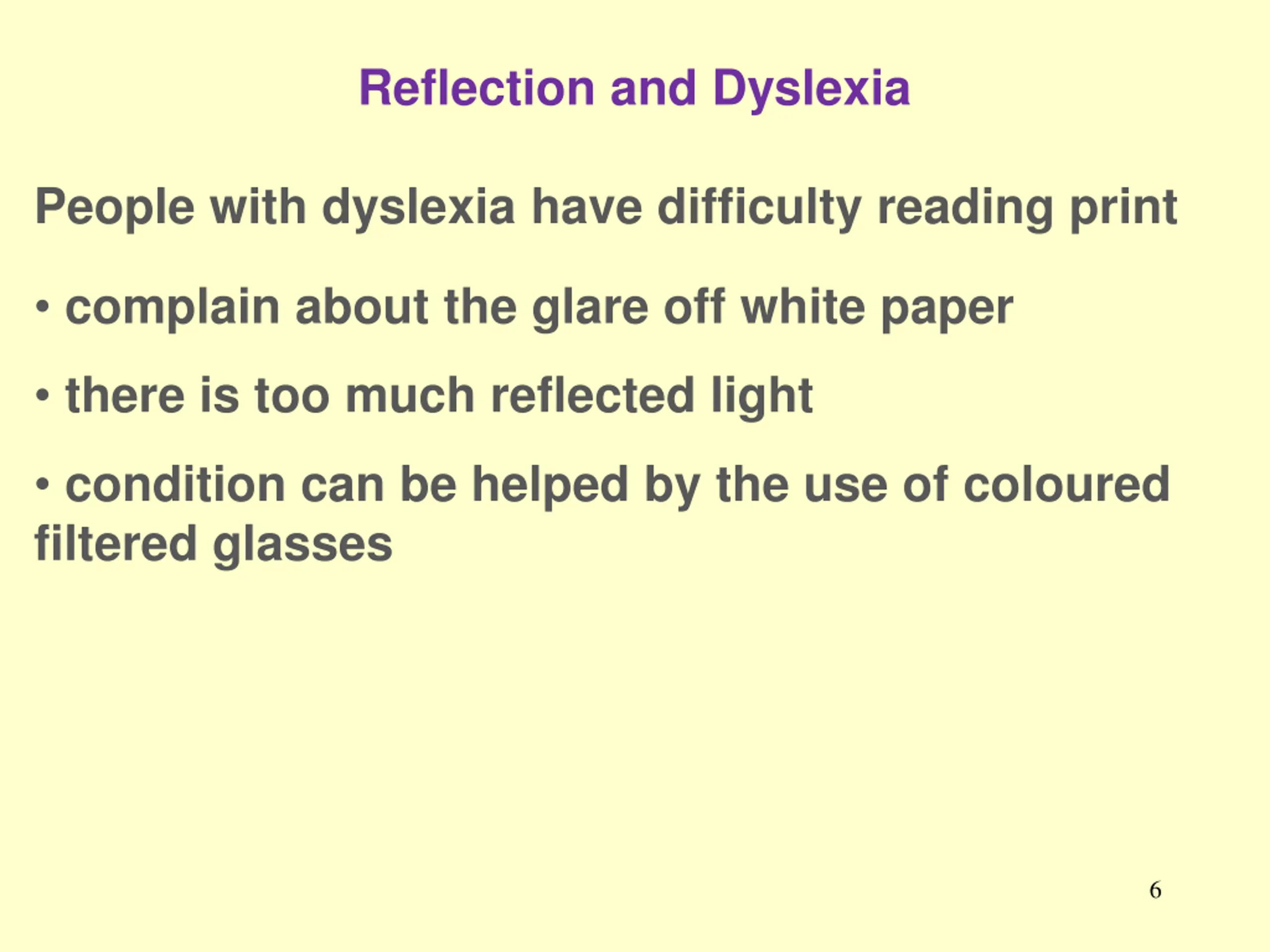 Reflection and Dyslexia People with dyslexia have difficulty reading print complain about the glare off white paper there is too much reflected light condition can be helped by the use of coloured filtered glasses 6