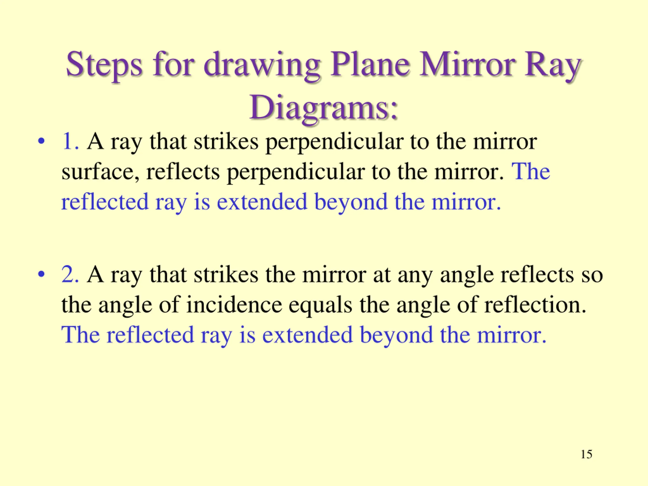 Steps for drawing Plane Mirror Ray Diagrams: 1. A ray that strikes perpendicular to the mirror surface, reflects perpendicular to the mirror. The reflected ray is extended beyond the mirror. 2. A ray that strikes the mirror at any angle reflects so the angle of incidence equals the angle of reflection. The reflected ray is extended beyond the mirror. 15