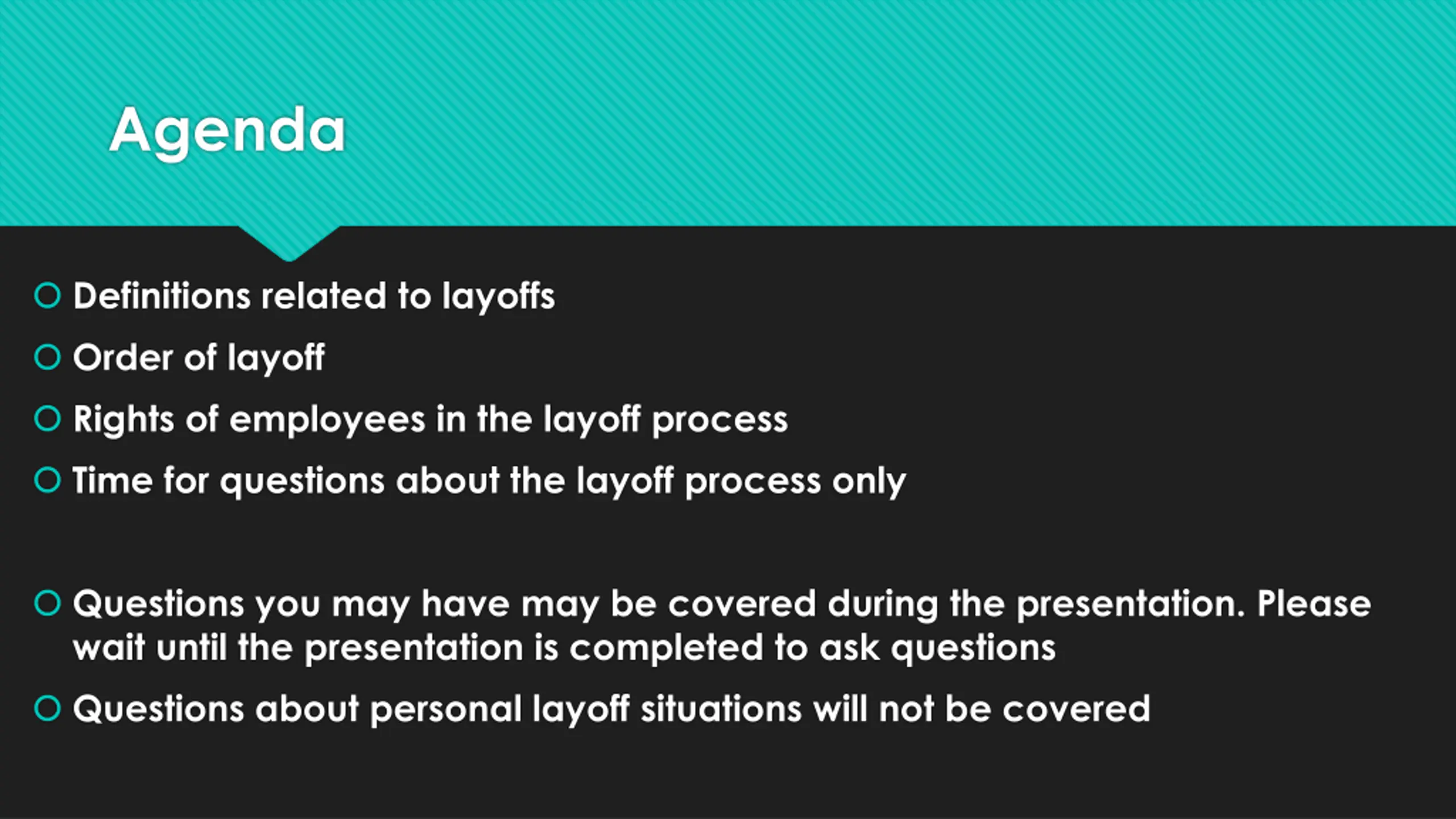 Agenda Definitions related to layoffs Order of layoff Rights of employees in the layoff process Time for questions about the layoff process only Questions you may have may be covered during the presentation. Please wait until the presentation is completed to ask questions Questions about personal layoff situations will not be covered