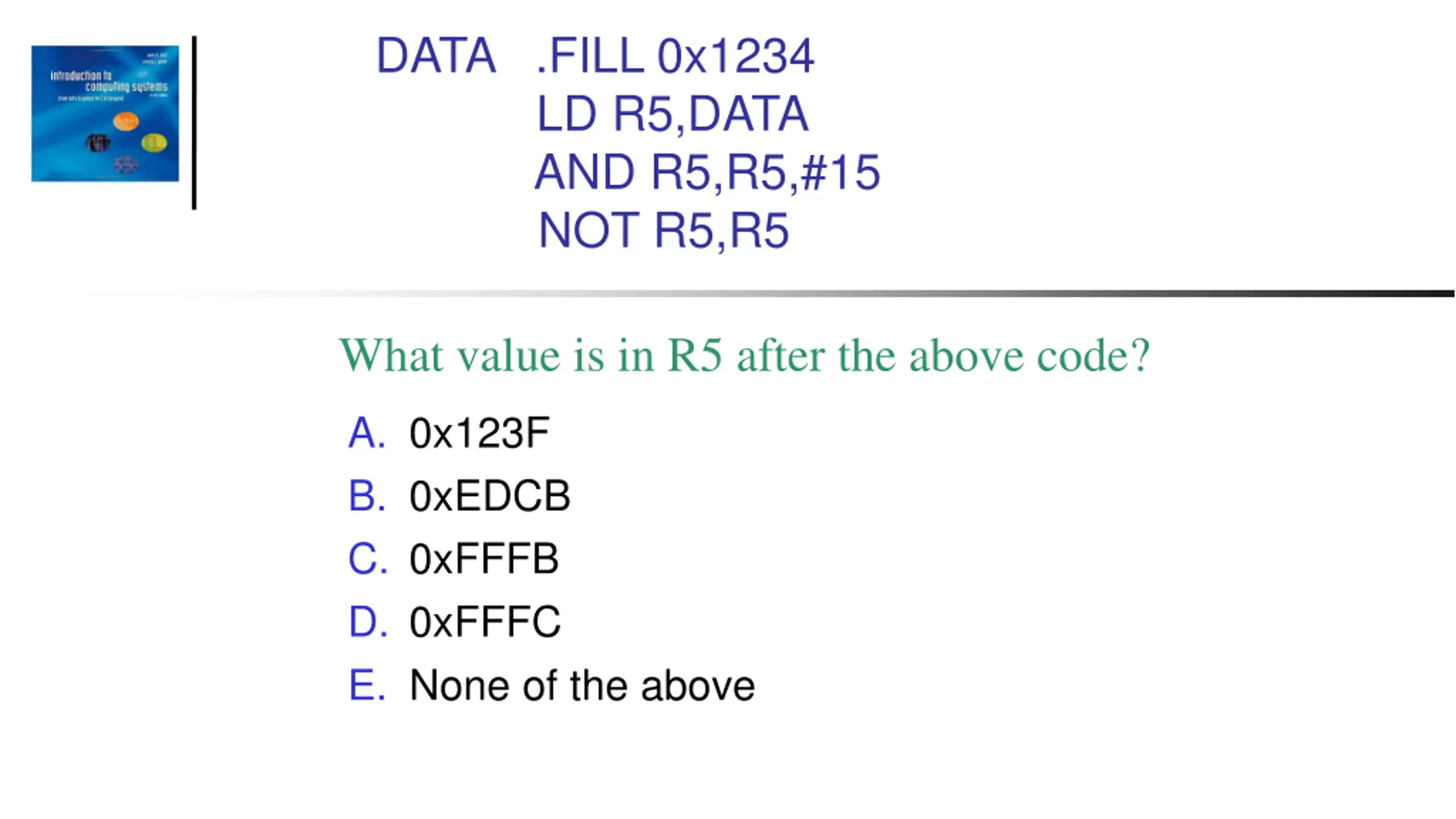 DATA .FILL 0x1234 LD R5,DATA AND R5,R5,#15 NOT R5,R5 What value is in R5 after the above code? A. 0x123F B. 0xEDCB C. 0xFFFB D. 0xFFFC E. None of the above