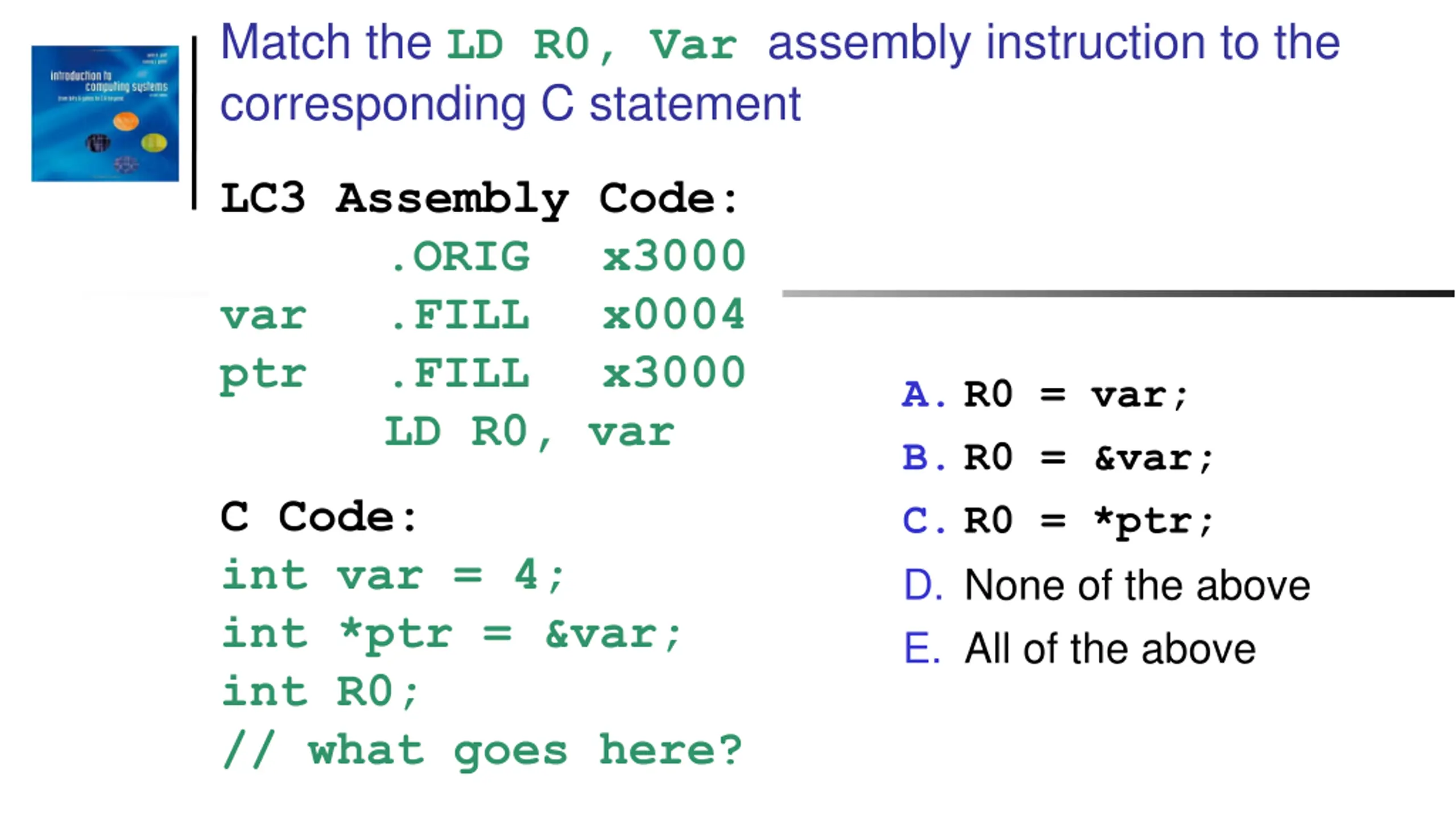 Match the LD R0, Var assembly instruction to the corresponding C statement LC3 Assembly Code: .ORIG x3000 var .FILL x0004 ptr .FILL x3000 LD R0, var C Code: int var = 4; int *ptr = &var; int R0; // what goes here? A. R0 = var; B. R0 = &var; C. R0 = *ptr; D. None of the above E. All of the above