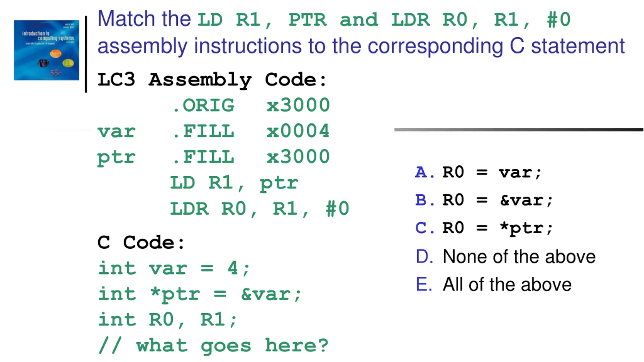Match the LD R1, PTR and LDR R0, R1, #0 assembly instructions to the corresponding C statement LC3 Assembly Code: .ORIG x3000 var .FILL x0004 ptr .FILL x3000 LD R1, ptr LDR R0, R1, #0 C Code: int var = 4; int *ptr = &var; int R0, R1; // what goes here? A. R0 = var; B. R0 = &var; C. R0 = *ptr; D. None of the above E. All of the above
