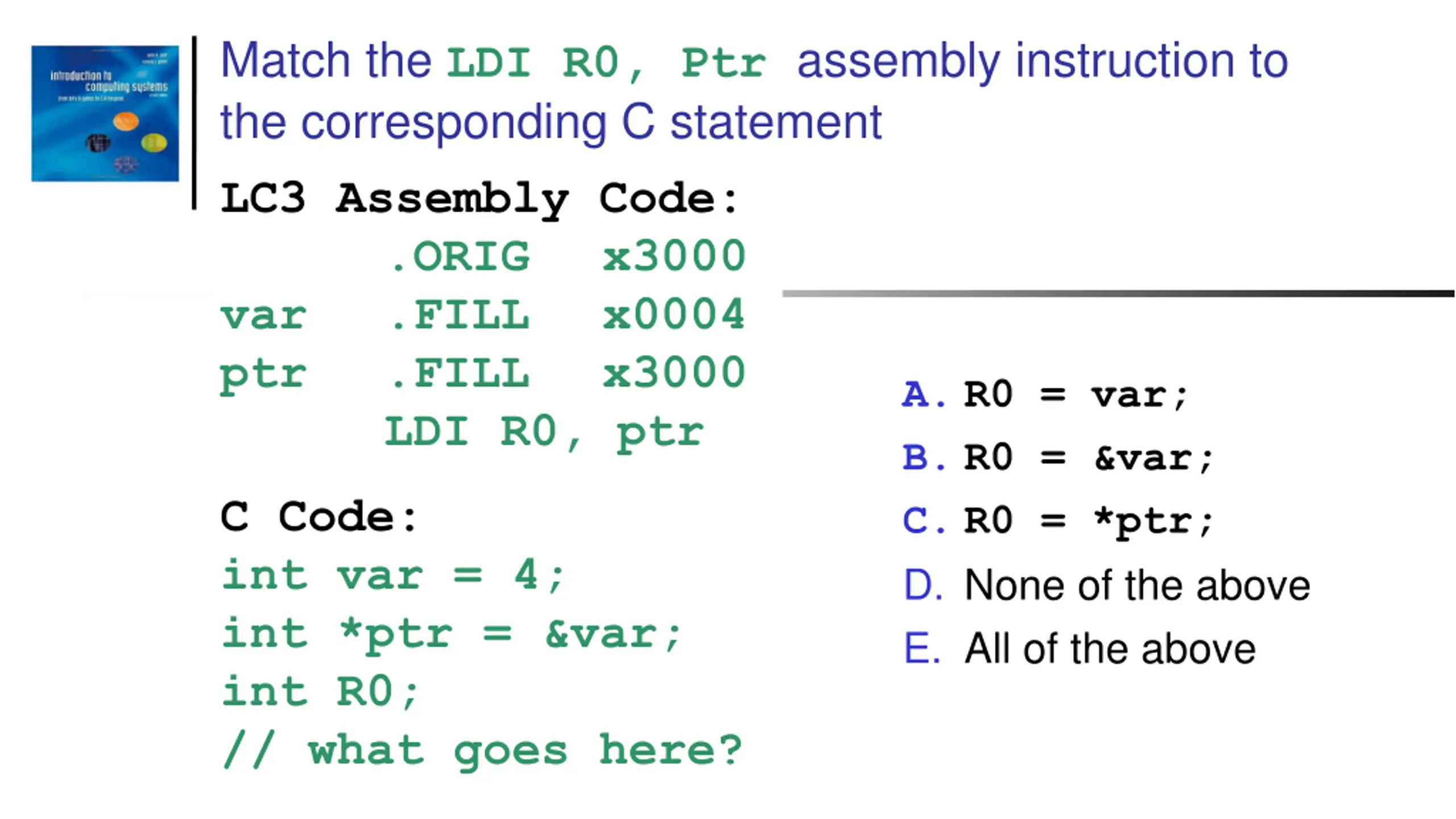 Match the LDI R0, Ptr assembly instruction to the corresponding C statement LC3 Assembly Code: .ORIG x3000 var .FILL x0004 ptr .FILL x3000 LDI R0, ptr C Code: int var = 4; int *ptr = &var; int R0; // what goes here? A. R0 = var; B. R0 = &var; C. R0 = *ptr; D. None of the above E. All of the above