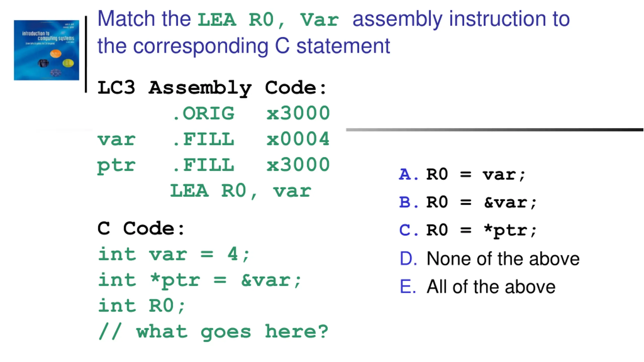 Match the LEA R0, Var assembly instruction to the corresponding C statement LC3 Assembly Code: .ORIG x3000 var .FILL x0004 ptr .FILL x3000 LEA R0, var C Code: int var = 4; int *ptr = &var; int R0; // what goes here? A. R0 = var; B. R0 = &var; C. R0 = *ptr; D. None of the above E. All of the above