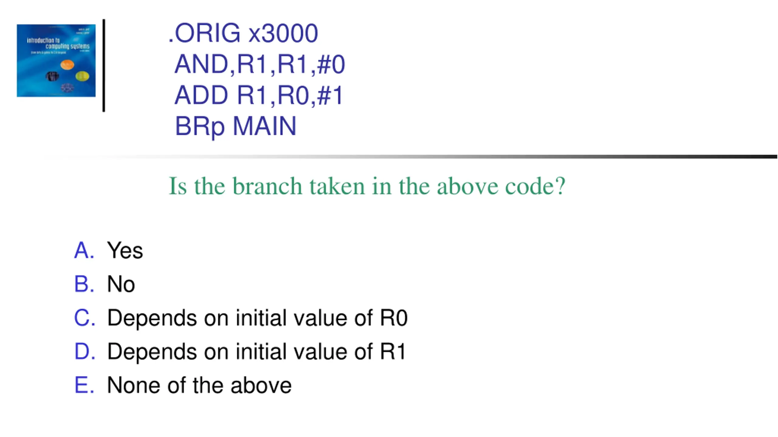 .ORIG x3000 AND,R1,R1,#0 ADD R1,R0,#1 BRp MAIN Is the branch taken in the above code? A. Yes B. No C. Depends on initial value of R0 D. Depends on initial value of R1 E. None of the above