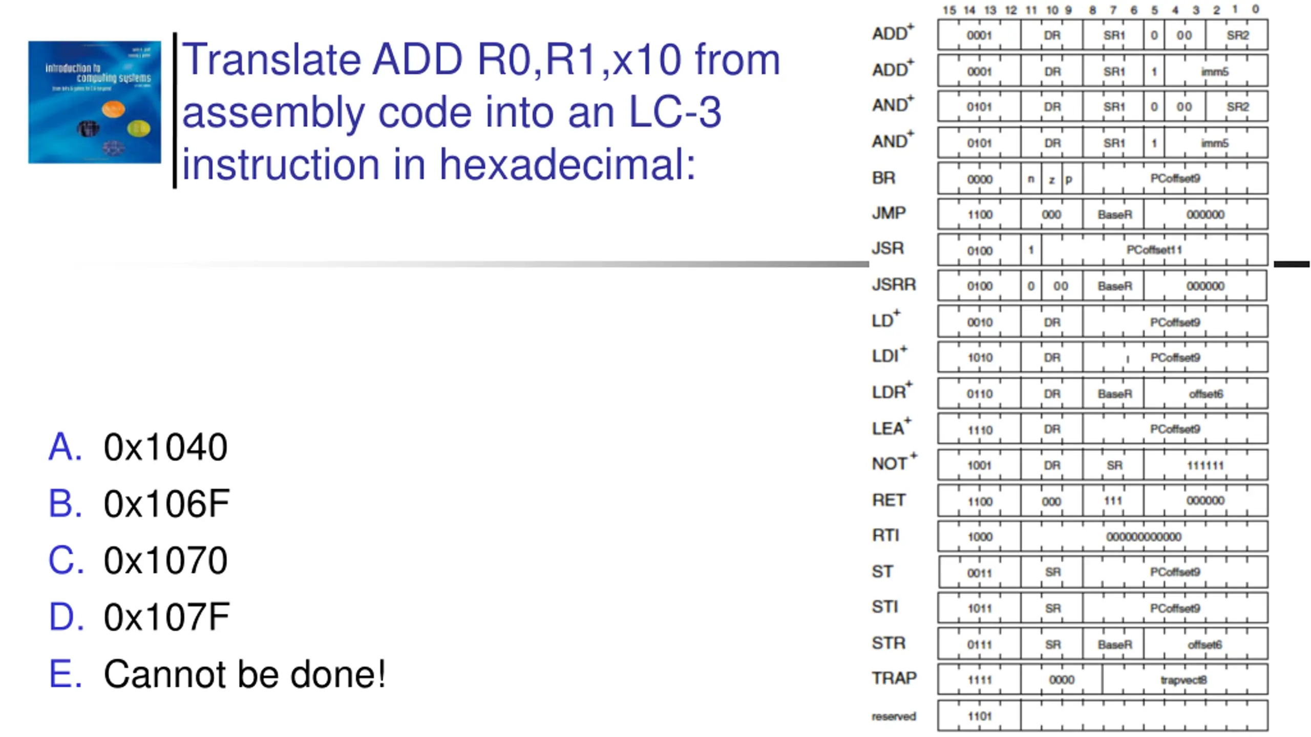 Translate ADD R0,R1,x10 from assembly code into an LC-3 instruction in hexadecimal: A. 0x1040 B. 0x106F C. 0x1070 D. 0x107F E. Cannot be done!