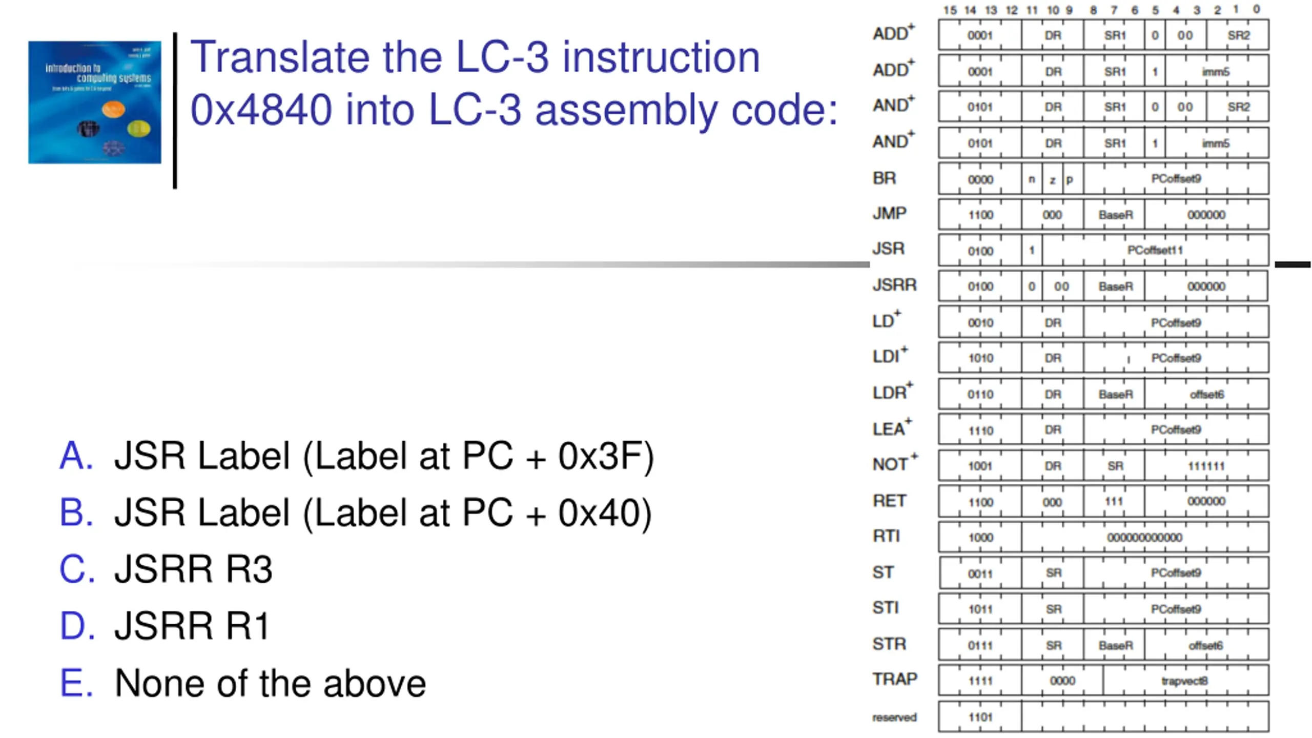 Translate the LC-3 instruction 0x4840 into LC-3 assembly code: A. JSR Label (Label at PC + 0x3F) B. JSR Label (Label at PC + 0x40) C. JSRR R3 D. JSRR R1 E. None of the above