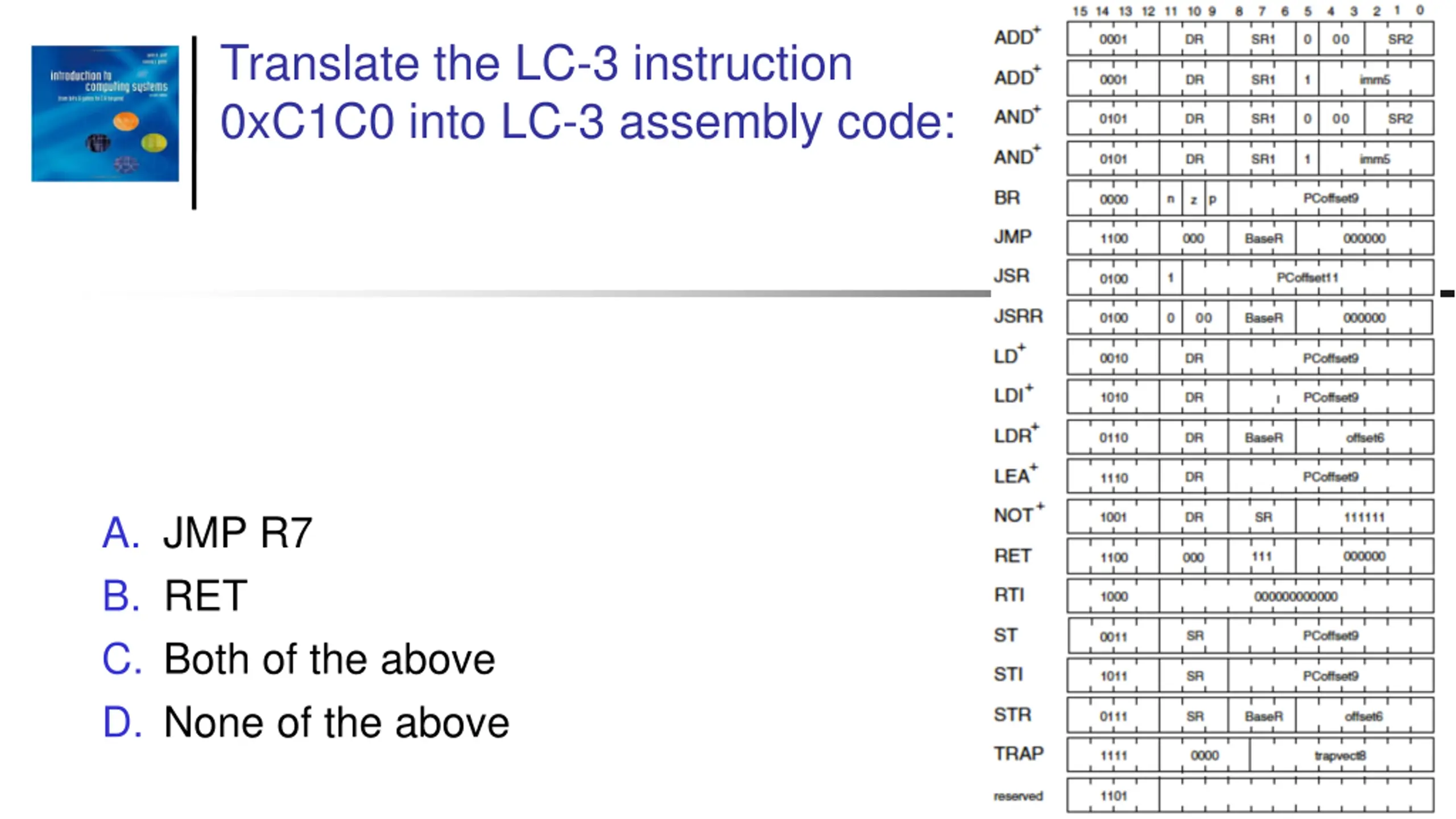 Translate the LC-3 instruction 0xC1C0 into LC-3 assembly code: A. JMP R7 B. RET C. Both of the above D. None of the above