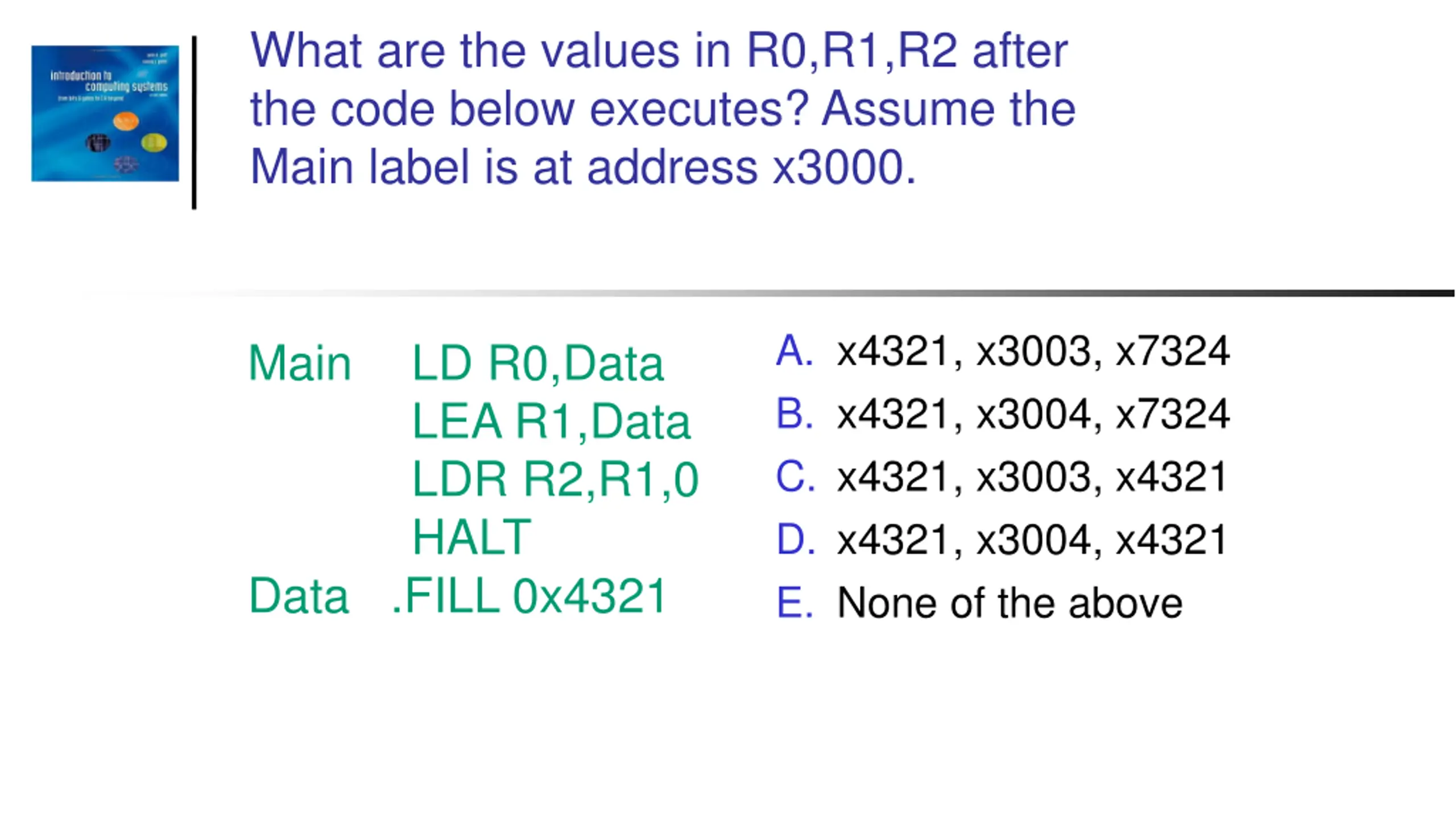 What are the values in R0,R1,R2 after the code below executes? Assume the Main label is at address x3000. A. x4321, x3003, x7324 B. x4321, x3004, x7324 C. x4321, x3003, x4321 D. x4321, x3004, x4321 E. None of the above Main LD R0,Data LEA R1,Data LDR R2,R1,0 HALT Data .FILL 0x4321