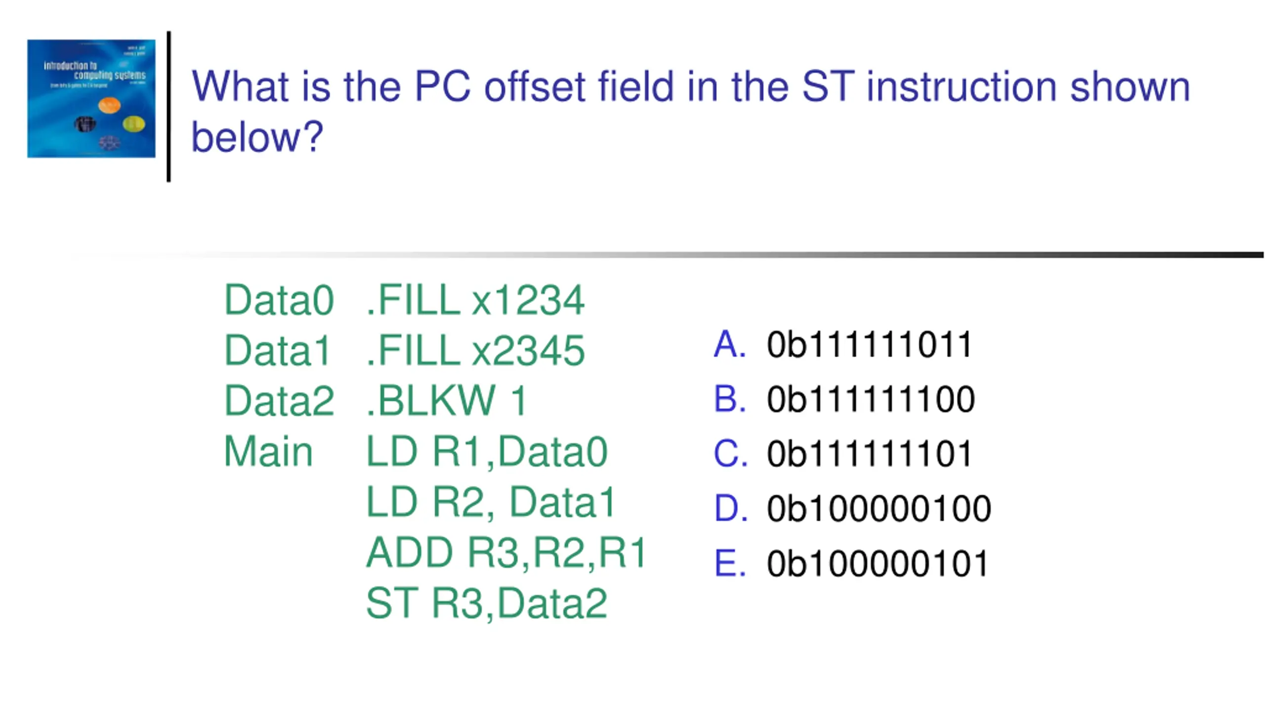 What is the PC offset field in the ST instruction shown below? Data0 .FILL x1234 Data1 .FILL x2345 Data2 .BLKW 1 Main LD R1,Data0 LD R2, Data1 ADD R3,R2,R1 ST R3,Data2 A. 0b111111011 B. 0b111111100 C. 0b111111101 D. 0b100000100 E. 0b100000101