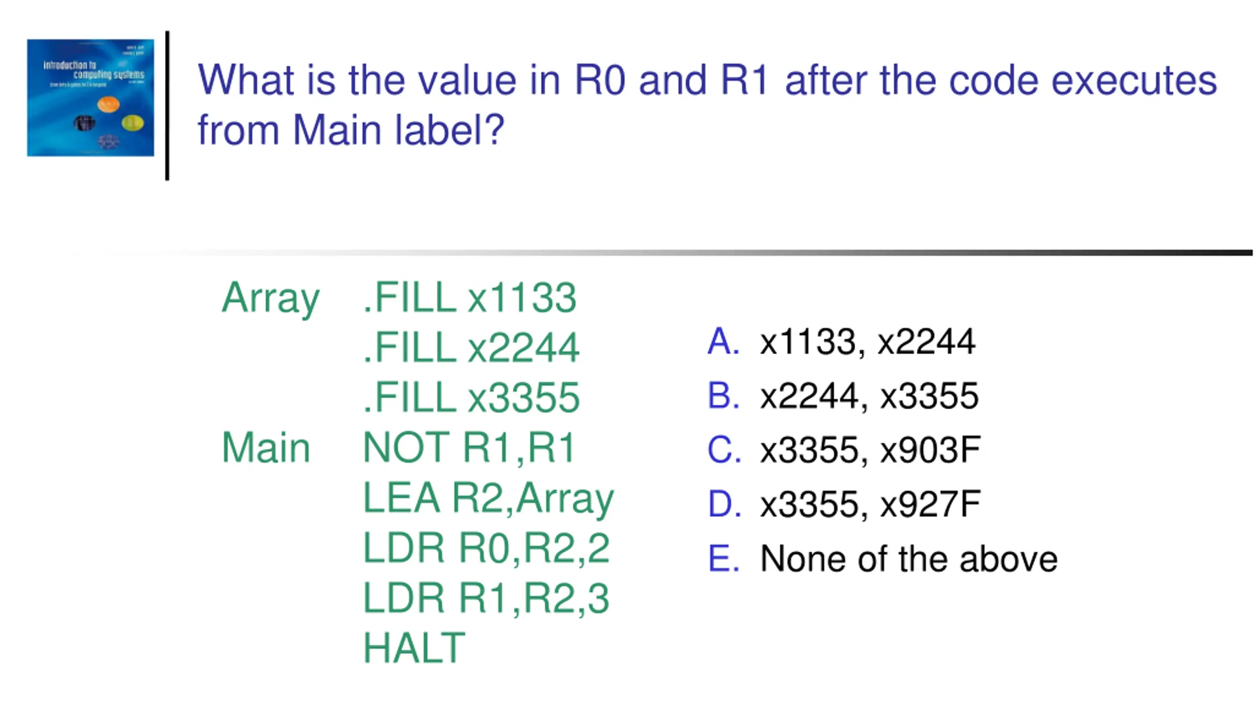 What is the value in R0 and R1 after the code executes from Main label? Array .FILL x1133 .FILL x2244 .FILL x3355 Main NOT R1,R1 LEA R2,Array LDR R0,R2,2 LDR R1,R2,3 HALT A. x1133, x2244 B. x2244, x3355 C. x3355, x903F D. x3355, x927F E. None of the above