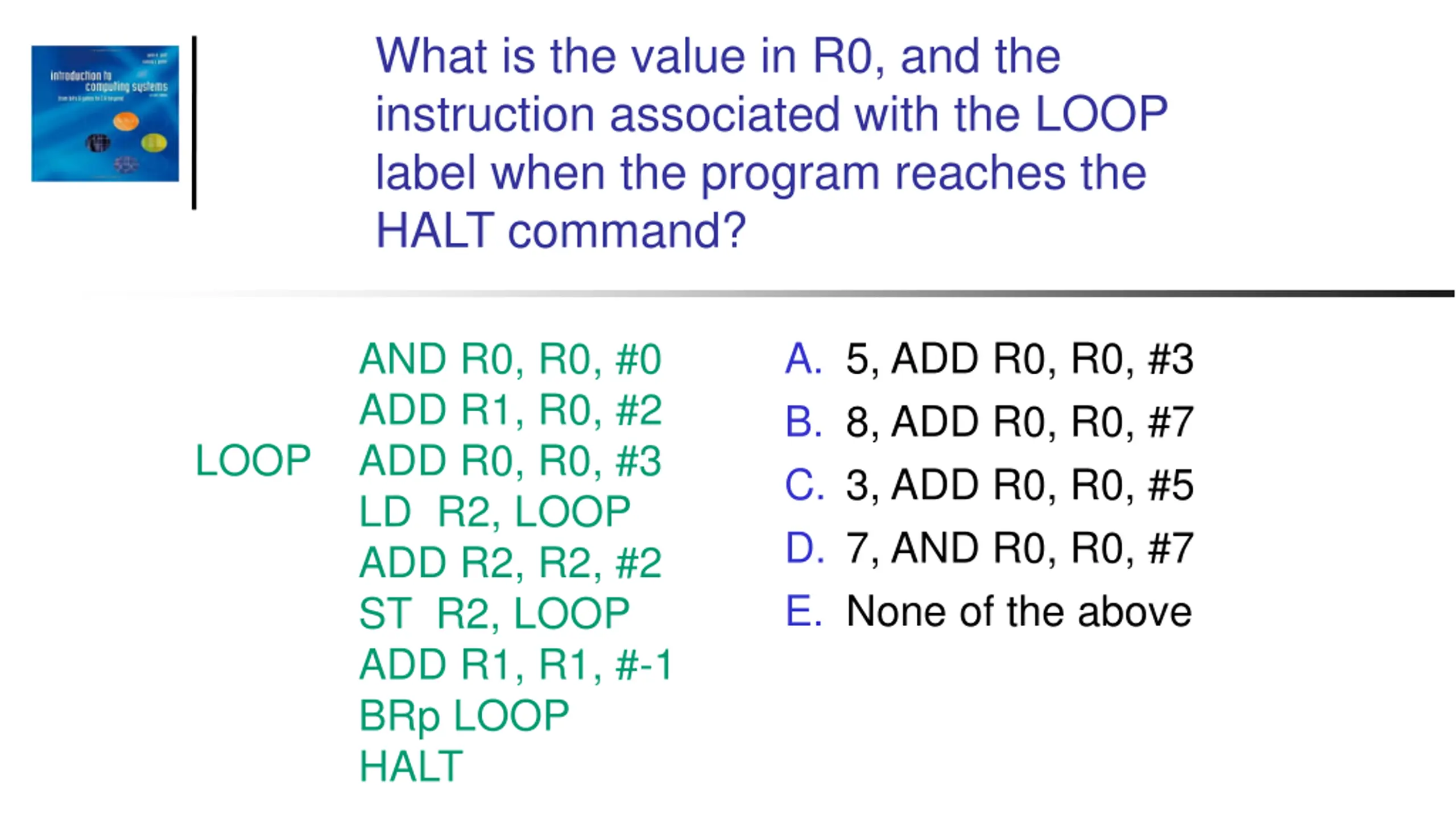 What is the value in R0, and the instruction associated with the LOOP label when the program reaches the HALT command? A. 5, ADD R0, R0, #3 B. 8, ADD R0, R0, #7 C. 3, ADD R0, R0, #5 D. 7, AND R0, R0, #7 E. None of the above AND R0, R0, #0 ADD R1, R0, #2 LOOP ADD R0, R0, #3 LD R2, LOOP ADD R2, R2, #2 ST R2, LOOP ADD R1, R1, #-1 BRp LOOP HALT