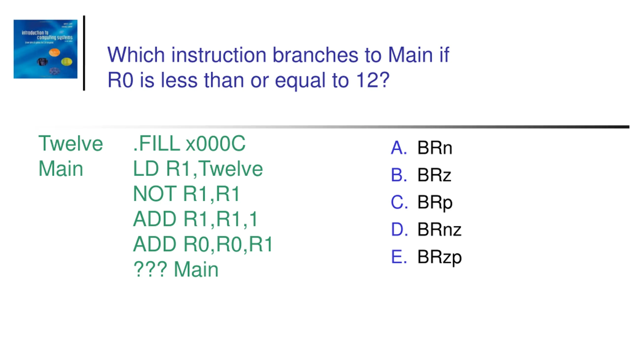 Which instruction branches to Main if R0 is less than or equal to 12? Twelve Main LD R1,Twelve NOT R1,R1 ADD R1,R1,1 ADD R0,R0,R1 ??? Main .FILL x000C A. BRn B. BRz C. BRp D. BRnz E. BRzp