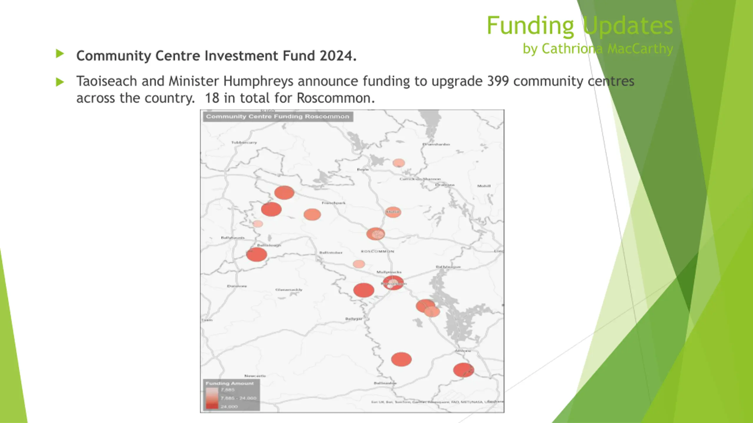 Funding Updates by Cathriona MacCarthy Community Centre Investment Fund 2024. Taoiseach and Minister Humphreys announce funding to upgrade 399 community centres across the country. 18 in total for Roscommon.
