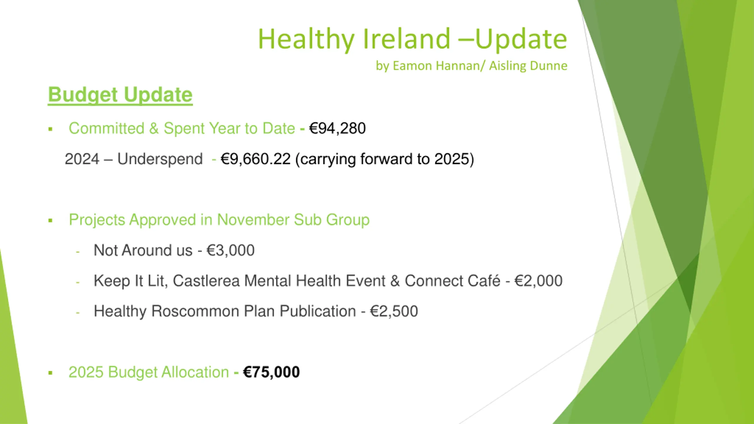 Healthy Ireland Update by Eamon Hannan/ Aisling Dunne Budget Update Committed & Spent Year to Date - 94,280 2024 Underspend - 9,660.22 (carrying forward to 2025) Projects Approved in November Sub Group - Not Around us - 3,000 - Keep It Lit, Castlerea Mental Health Event & Connect Caf - 2,000 - Healthy Roscommon Plan Publication - 2,500 2025 Budget Allocation - 75,000