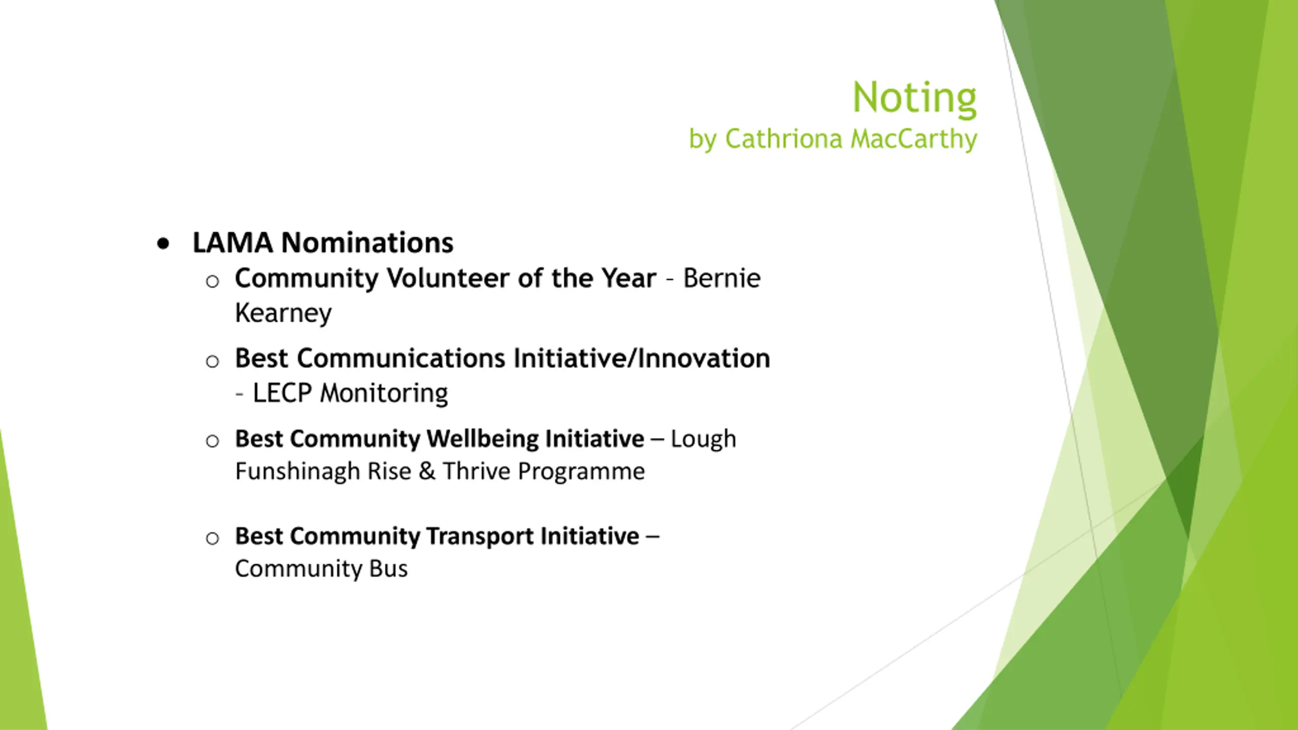 Noting by Cathriona MacCarthy LAMA Nominations o Community Volunteer of the Year Bernie Kearney o Best Communications Initiative/Innovation LECP Monitoring o Best Community Wellbeing Initiative Lough Funshinagh Rise & Thrive Programme o Best Community Transport Initiative Community Bus