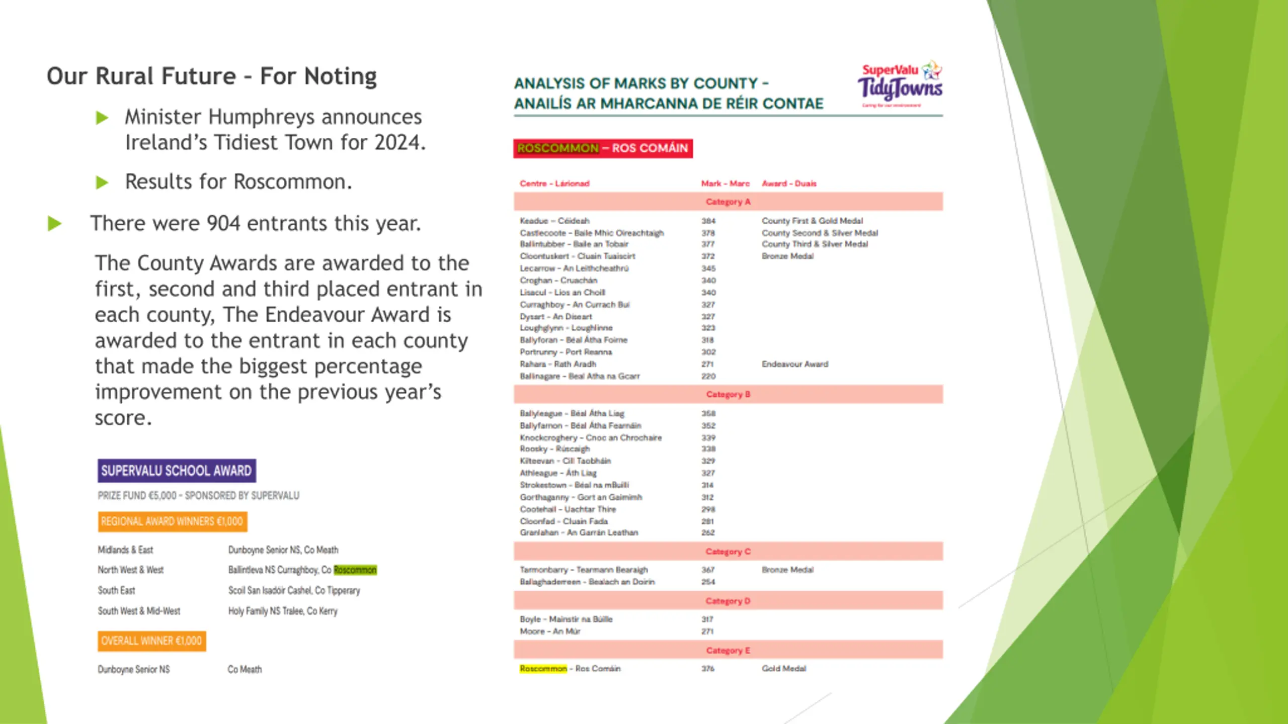 Our Rural Future For Noting Minister Humphreys announces Ireland s Tidiest Town for 2024. Results for Roscommon. There were 904 entrants this year. The County Awards are awarded to the first, second and third placed entrant in each county, The Endeavour Award is awarded to the entrant in each county that made the biggest percentage improvement on the previous year s score.