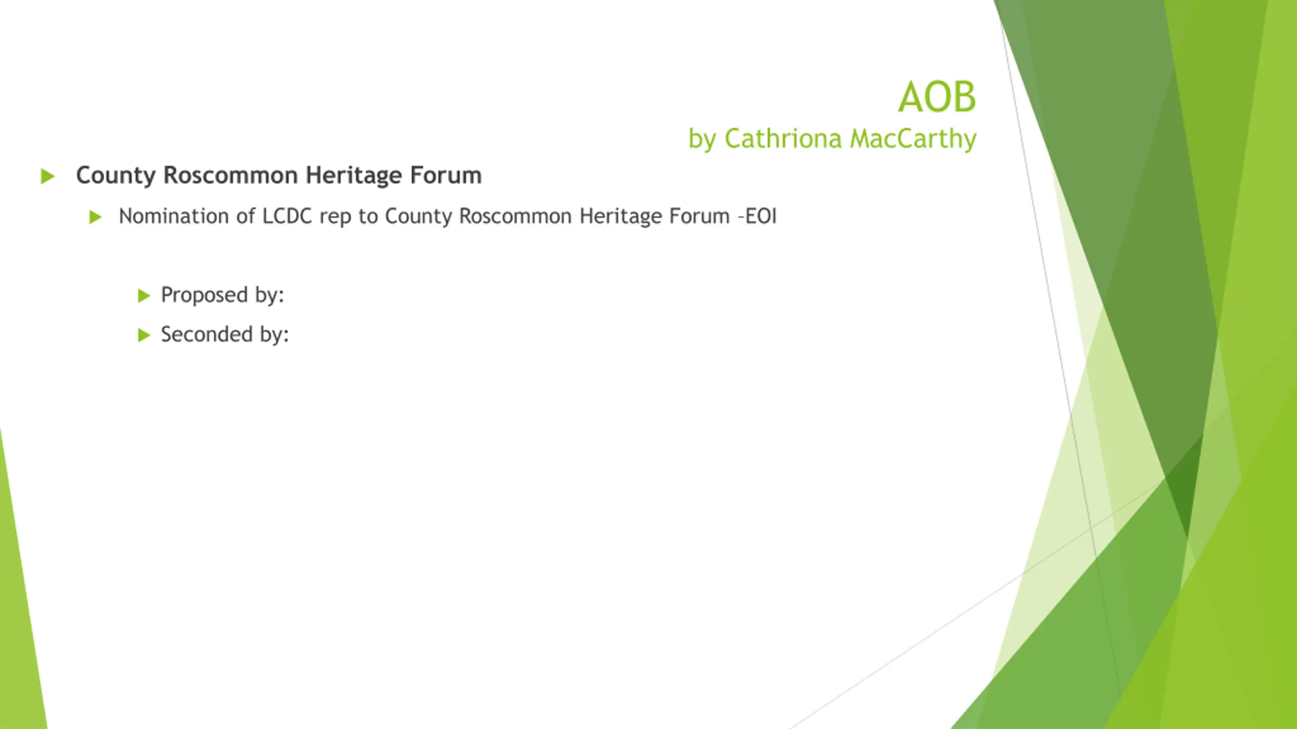 AOB by Cathriona MacCarthy County Roscommon Heritage Forum Nomination of LCDC rep to County Roscommon Heritage Forum EOI Proposed by: Seconded by: