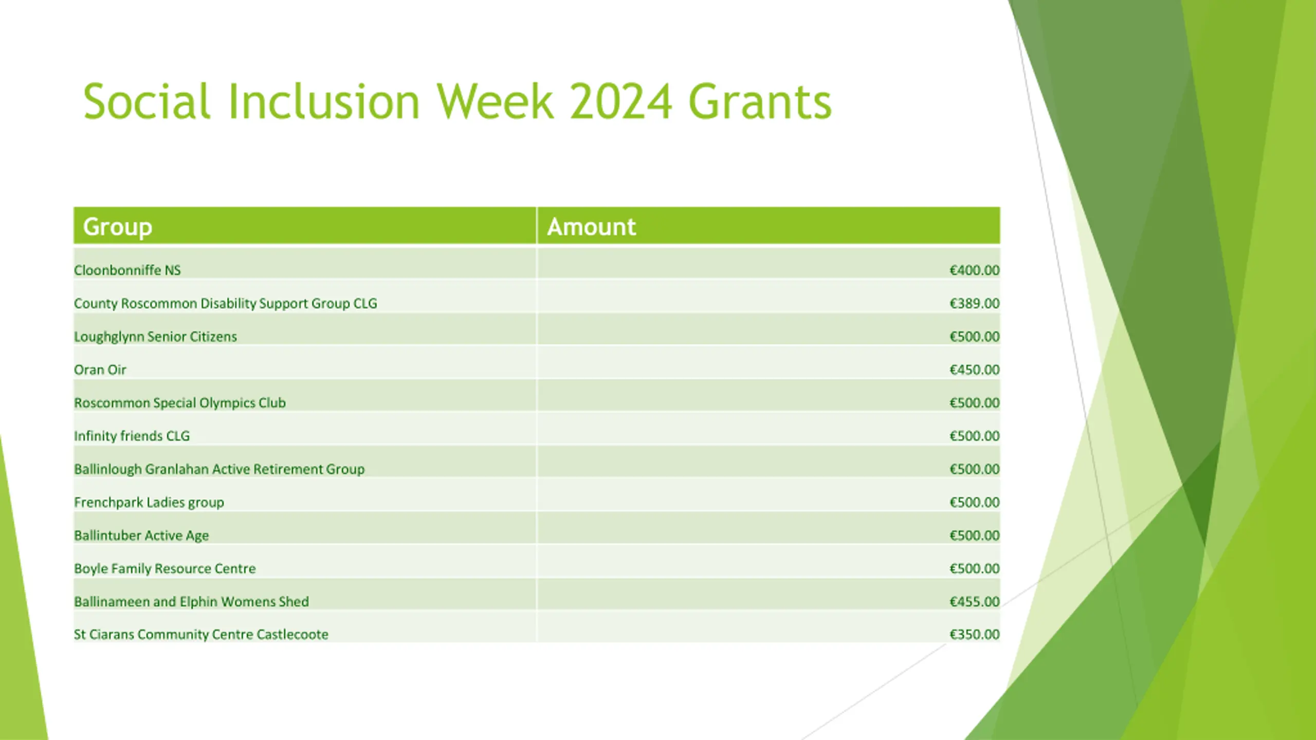 Social Inclusion Week 2024 Grants Group Amount Cloonbonniffe NS 400.00 County Roscommon Disability Support Group CLG 389.00 Loughglynn Senior Citizens 500.00 Oran Oir 450.00 Roscommon Special Olympics Club 500.00 Infinity friends CLG 500.00 Ballinlough Granlahan Active Retirement Group 500.00 Frenchpark Ladies group 500.00 Ballintuber Active Age 500.00 Boyle Family Resource Centre 500.00 Ballinameen and Elphin Womens Shed 455.00 St Ciarans Community Centre Castlecoote 350.00